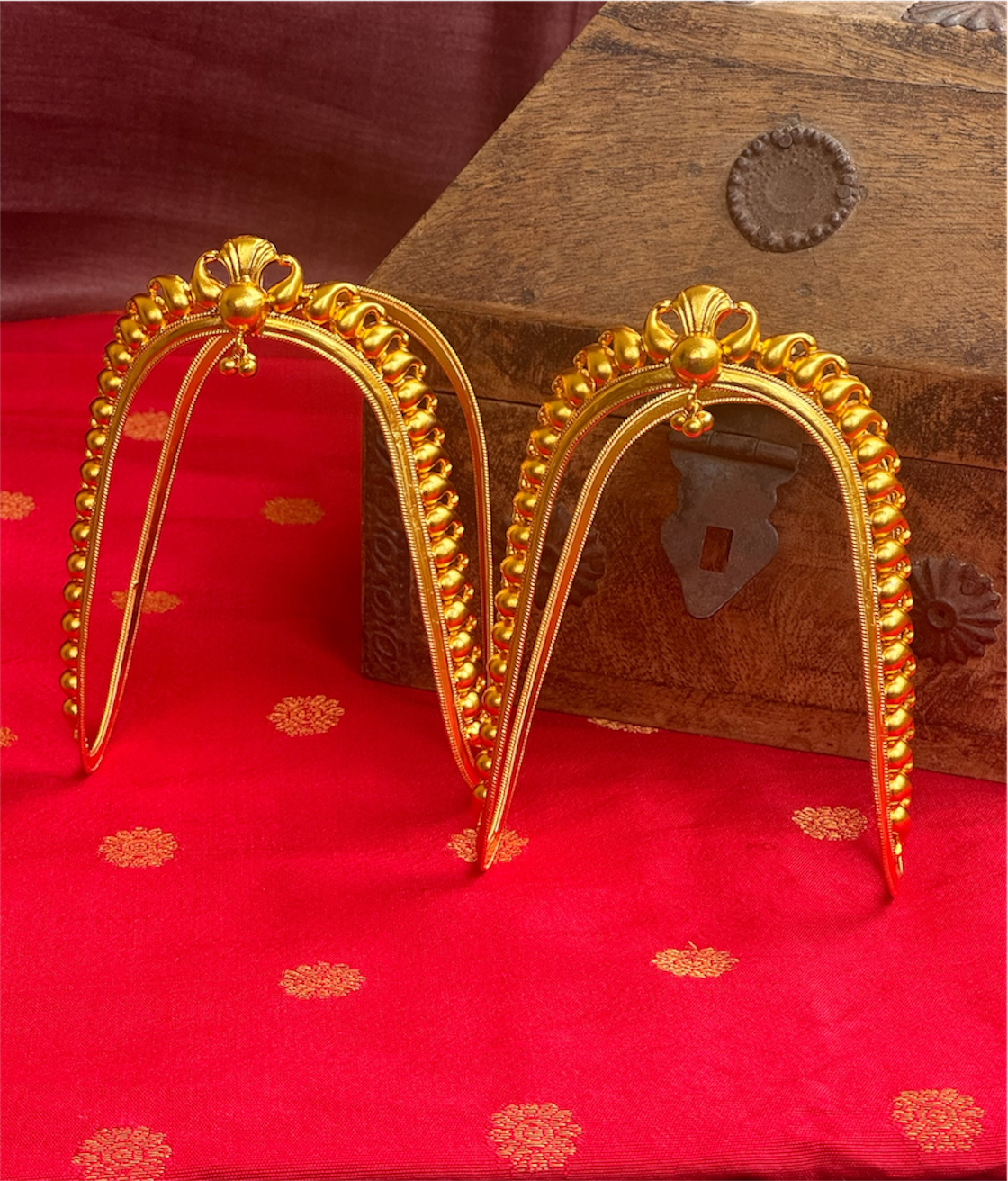 Our latest creation honors this ancient South Indian tradition. Handcrafted in 92.5 Sterling Silver and dipped in 24k gold for that authentic antique glow, it features the "Manga" (paisley) motif—a timeless emblem of elegance.
