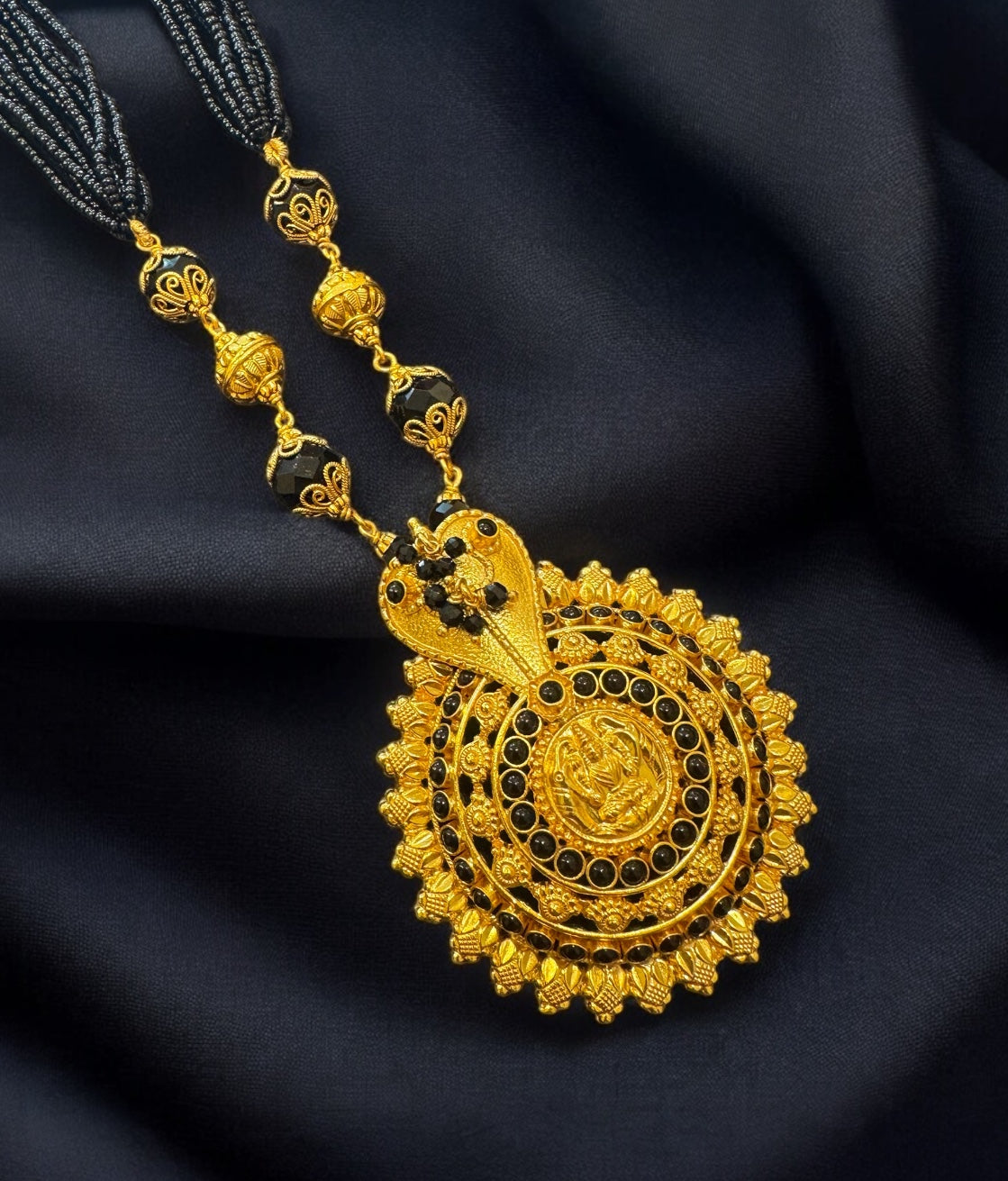 The pendant itself is a masterpiece of craftsmanship. It features a traditional round shape, crowned with a stylized cobra hood, a powerful symbol of fertility and protection. The cobra’s eyes are set with black Onyx adding a touch of vibrancy and elegance. At the heart of the pendant is the divine image of Goddess Lakshmi, embodying prosperity and blessings.