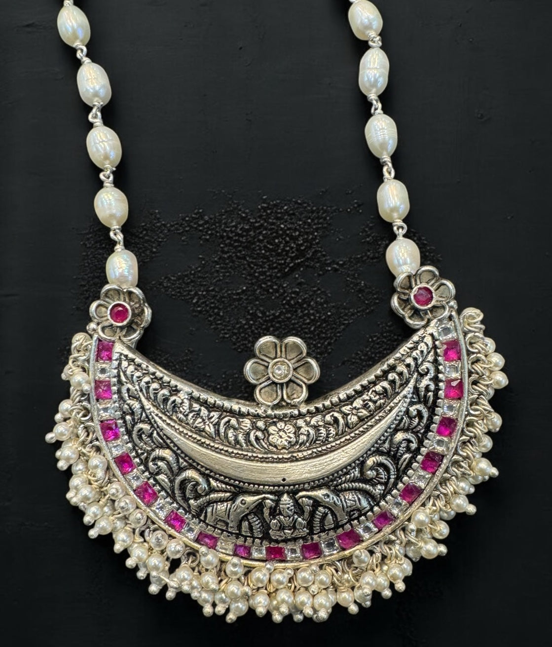The Tanmaya Kokkethathi Silver Pearl Necklace (Oxidised)