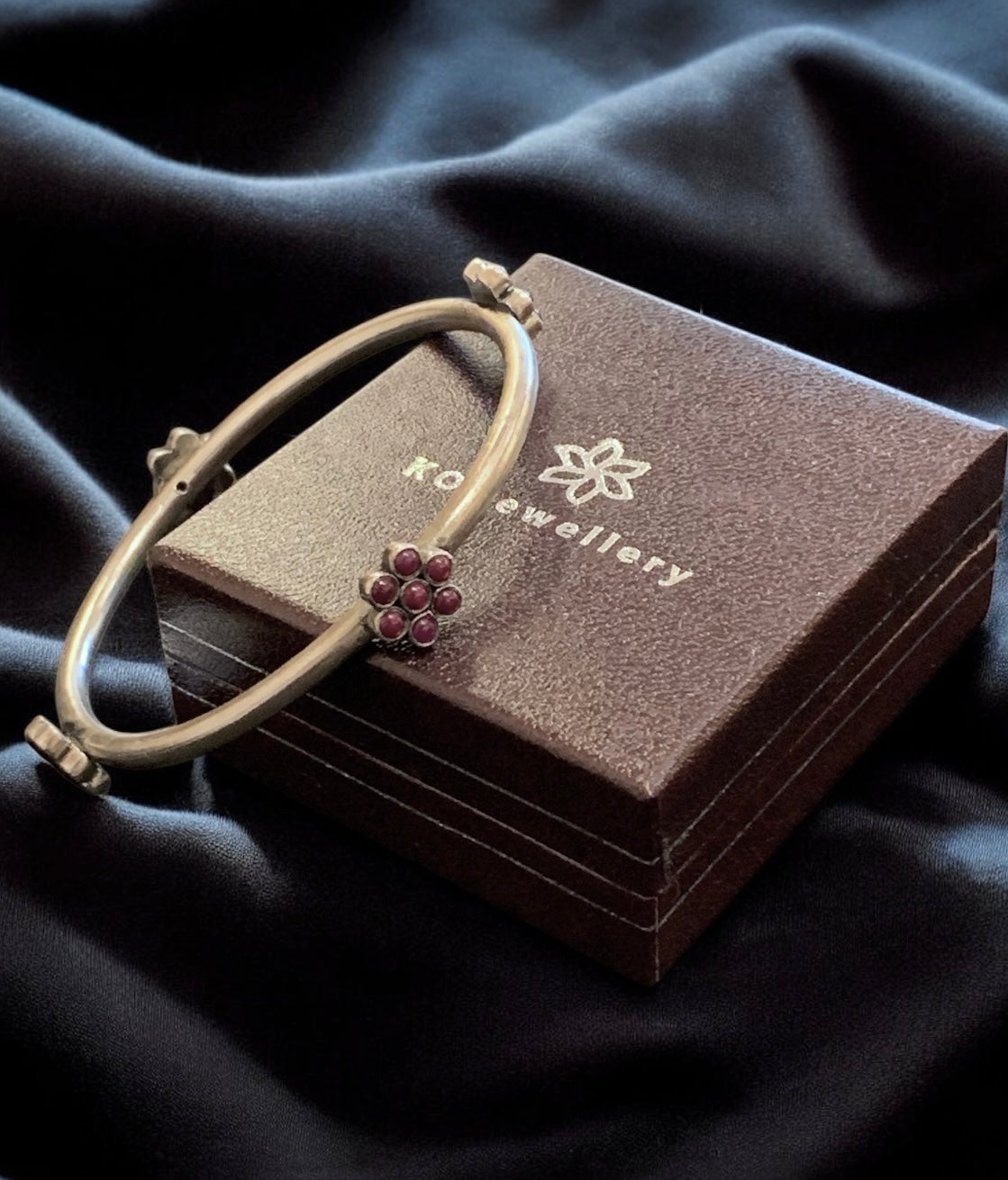 Elevate your traditional look with this exquisite Sterling Silver (92.5%) bangle, adorned with intricate handcrafted floral design and radiant kempu stones. Inspired by the rich heritage of South Indian temple jewellery, this piece is brought to life through 5–6 meticulous artisanal processes, preserving centuries-old craftsmanship. A timeless accessory to complete any festive or cultural occasion. Expertly handcrafted in Sterling Silver (92.5%) using age-old techniques passed down through generations, each kada is oxidised through a special process to achieve a rich, antique finish. Perfect to pair with sarees or ethnic ensembles, the bangle is also available in a striking gold-dipped finish for a regal touch.
