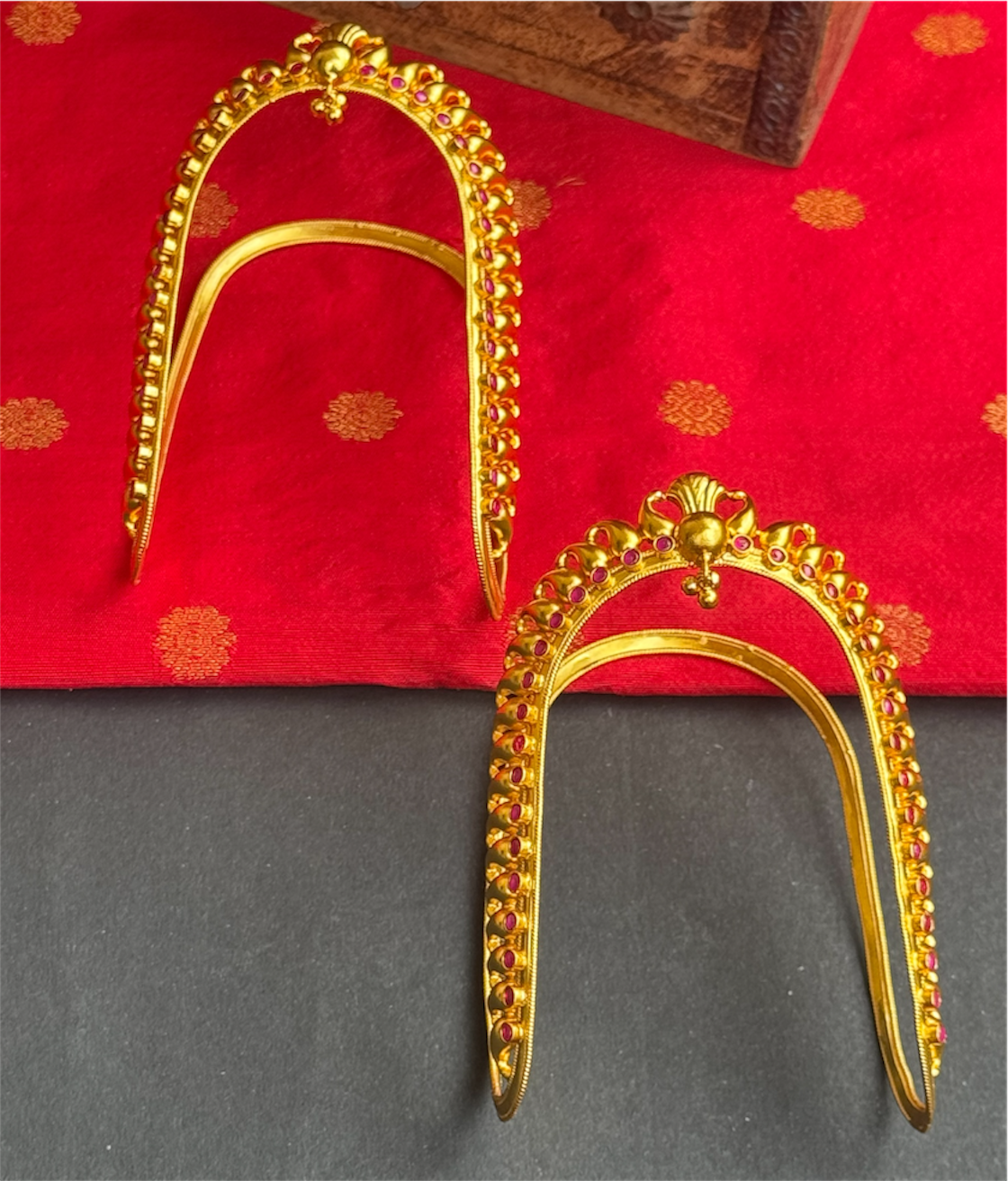 Our latest creation honors this ancient South Indian tradition. Handcrafted in 92.5 Sterling Silver and dipped in 24k gold for that authentic antique glow, it features the "Manga" (paisley) motif—a timeless emblem of elegance.