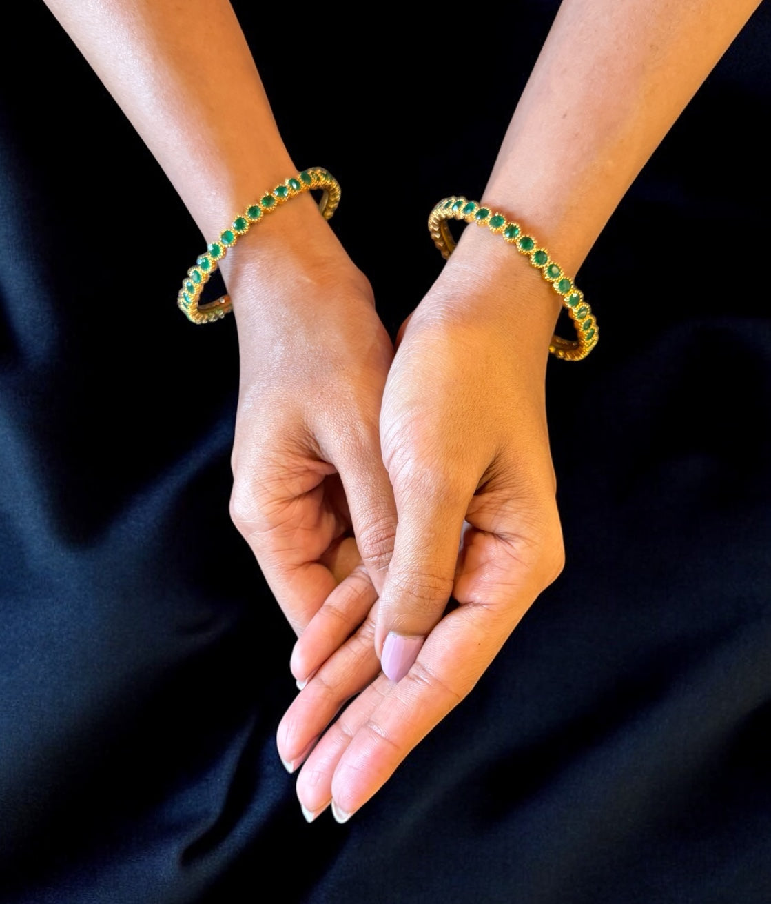 Celebrate timeless tradition with this stunning heritage temple jewellery bangle, handcrafted in antique Sterling Silver (92.5%) and dipped in radiant 24K gold. Designed in the classic South Indian style, the bangle is studded with vibrant green kemp stones, beautifully accented by touches of deep red kemp, capturing the essence of royal temple adornment.