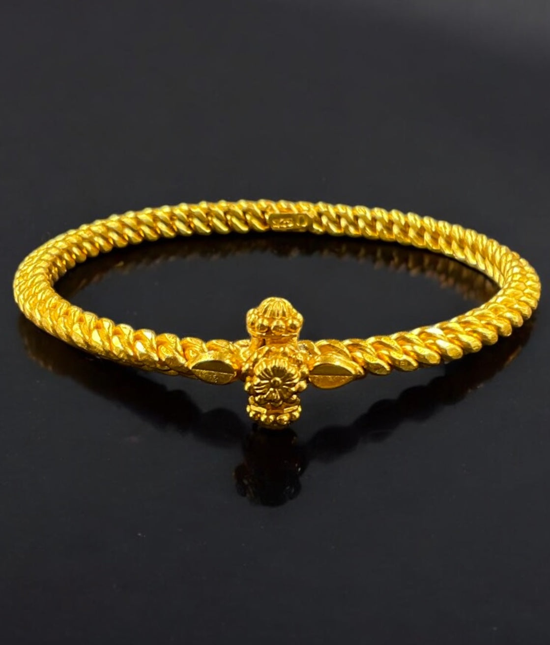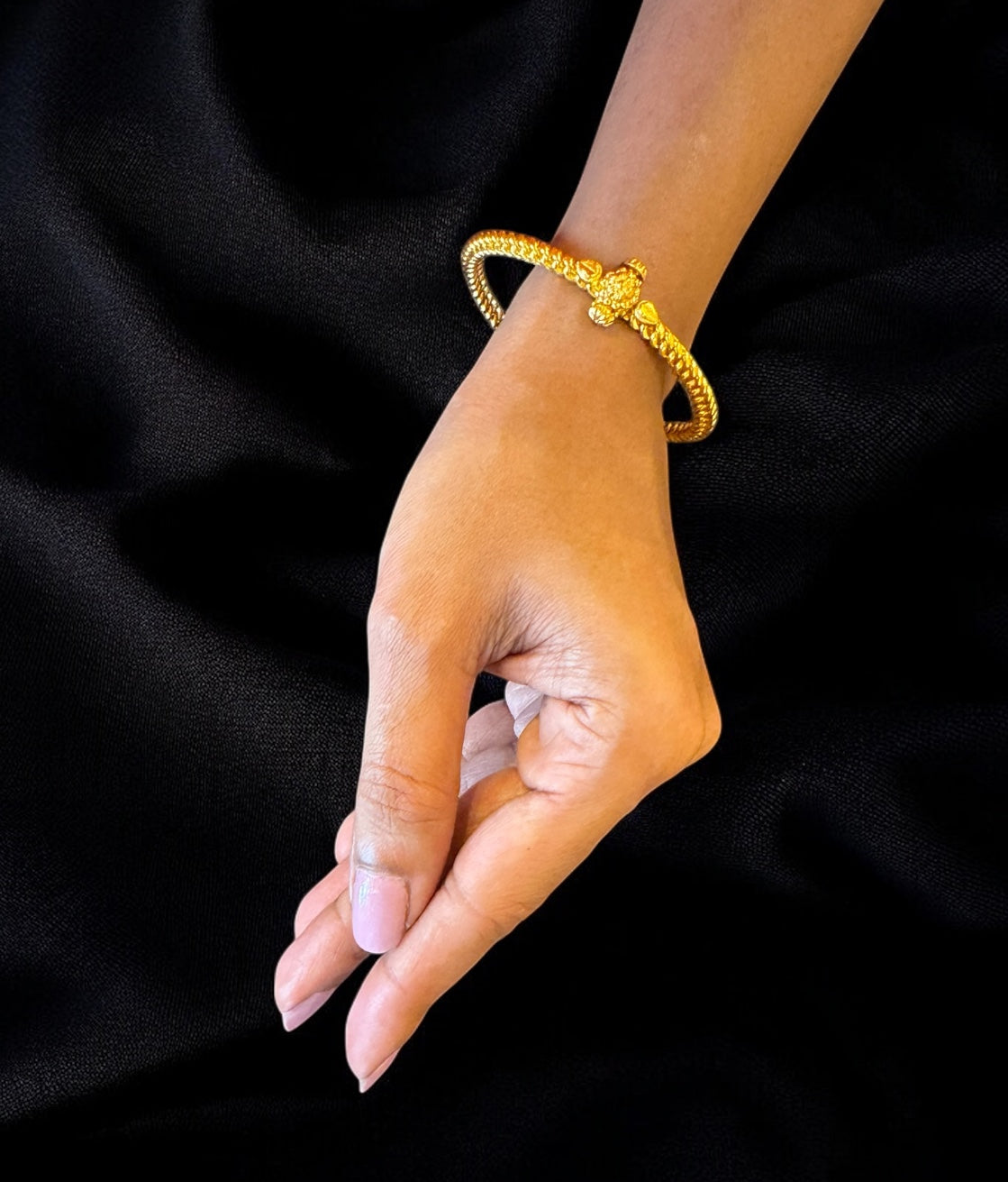 Inspired by ancient South Indian temple jewellery, this piece carries the essence of tradition and timeless beauty. The bangle is meticulously handcrafted using methods once reserved for crafting antique gold ornaments, and is dipped in pure 24K gold to give it a rich, regal finish.