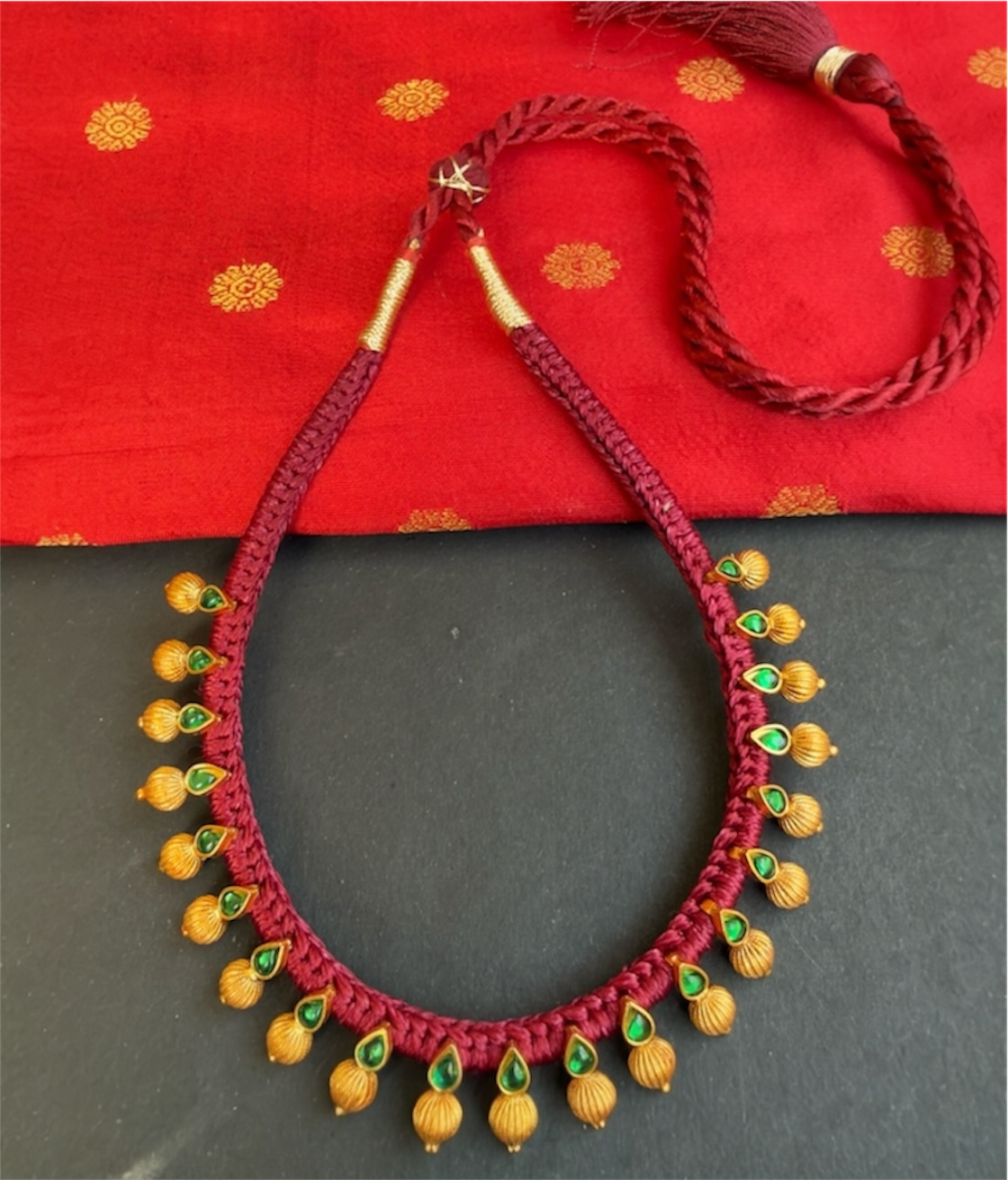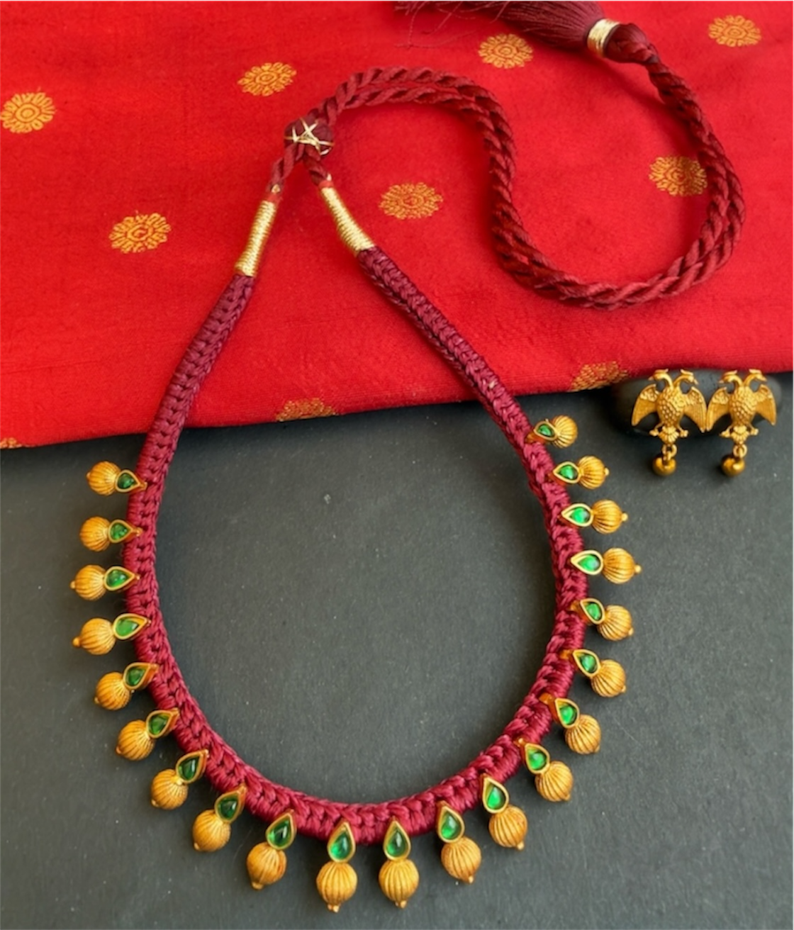Gold-dipped round beads of sterling silver(92.5%) are handwoven into black cotton thread to create this lovely ethnic necklace. The necklace is in a choker design. Crafted using techniques used in ancient South Indian antique gold temple jewellery the entire piece is crafted in pure silver and gold-dipped. Pair it with one of our antique-looking jhumkas and you are all set to dazzle...