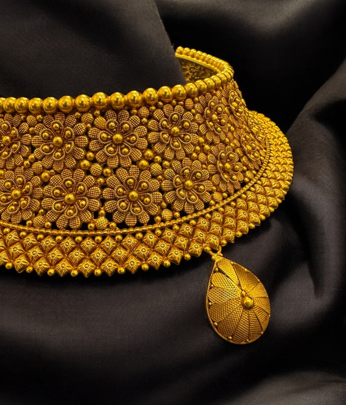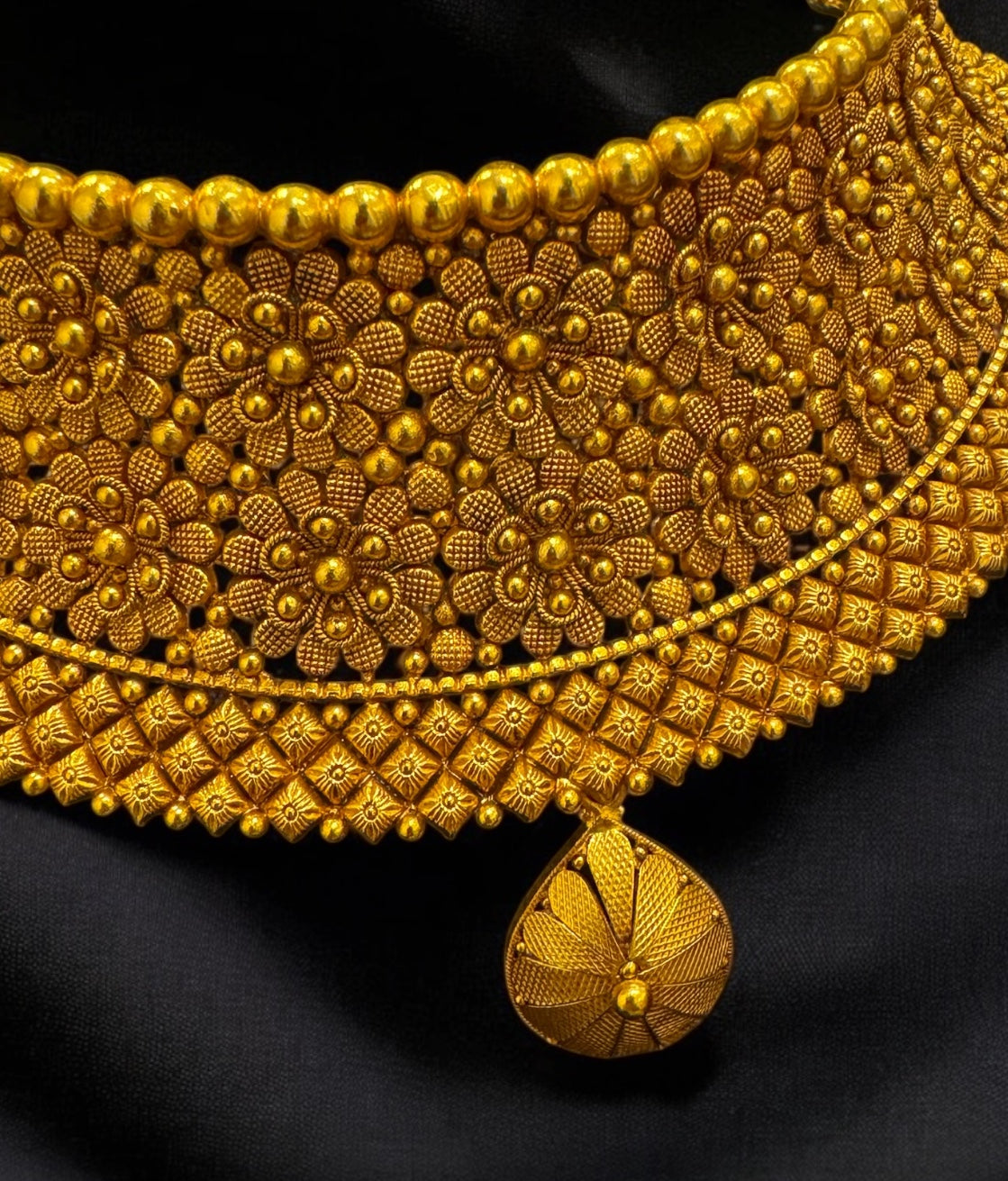 Exquisite and regal, this bridal choker is handcrafted in pure 92.5% Sterling Silver and plated with 24K gold. Showcasing intricate filigree work it embodies timeless elegance and grandeur. The delicate detailing and rich craftsmanship make it a statement piece for brides seeking heritage charm with a luxurious finish. Perfect for pairing with traditional ensembles on your most special day. This stunning piece is made pure 92.5% Sterling Silver, ensuring lasting quality and shine. It is gold dipped in 24 K gold for a rich, antique-inspired finish that radiates timeless charm.