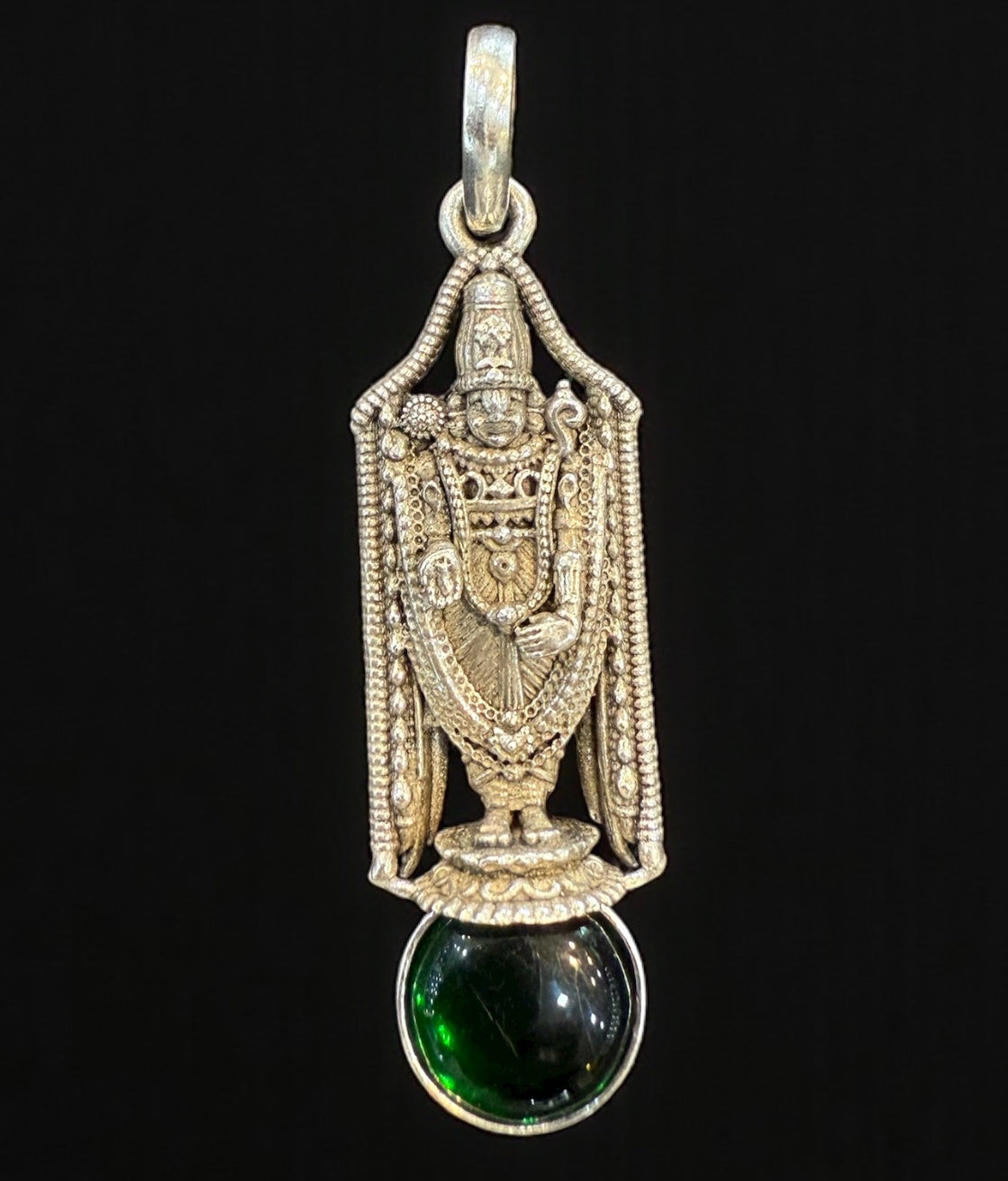 The Madhava Silver Venkateshwara Green Kemp Pendant (Oxidised)