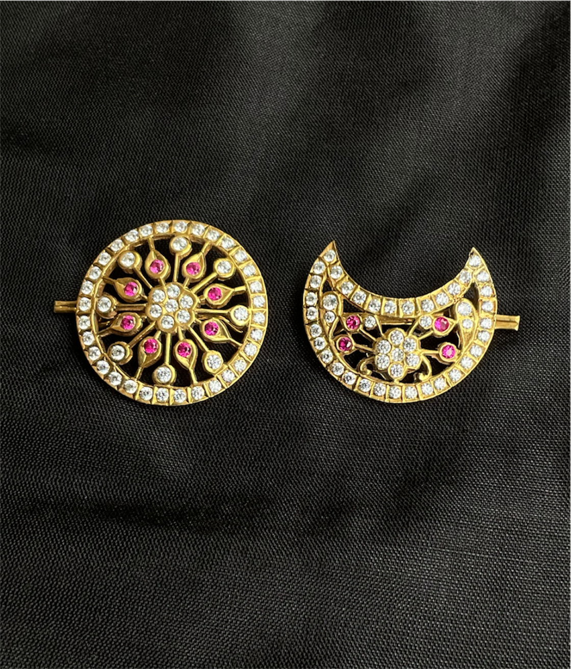 Adorn yourself with the timeless elegance of South Indian bridal tradition with this exquisite pair of Surya–Chandra hair ornaments. An iconic element of classical temple jewellery, the Surya (Sun) and Chandra (Moon) are worn gracefully on either side of the bride’s head, symbolising the perfect harmony of celestial forces.