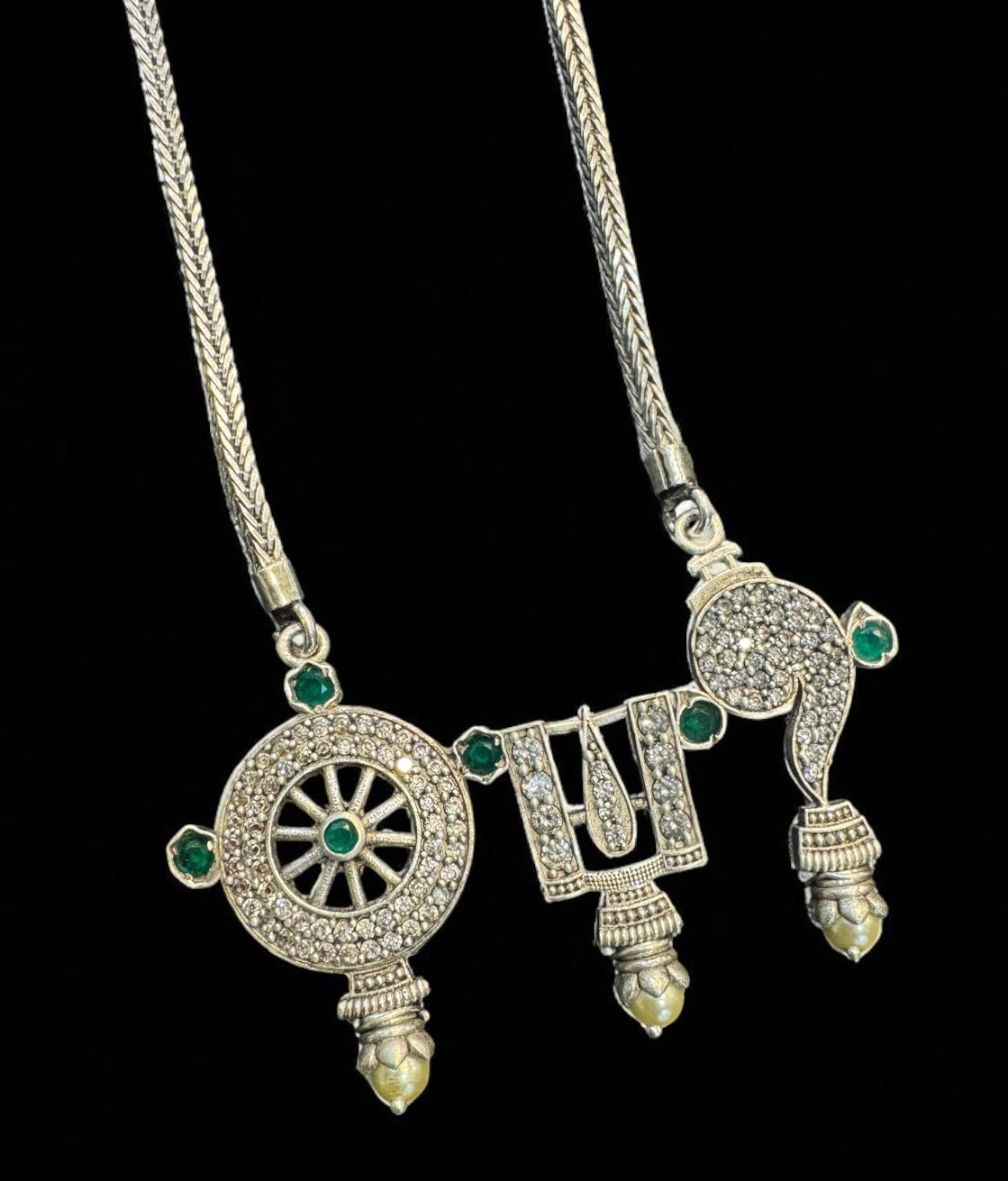 Elevate your jewellery collection with this exquisite necklace with Shankhu, Chakra, and Naama-symbols sacred and auspicious to Vaishnavites. This handcrafted necklace is made in pure 92.5 Sterling Silver.