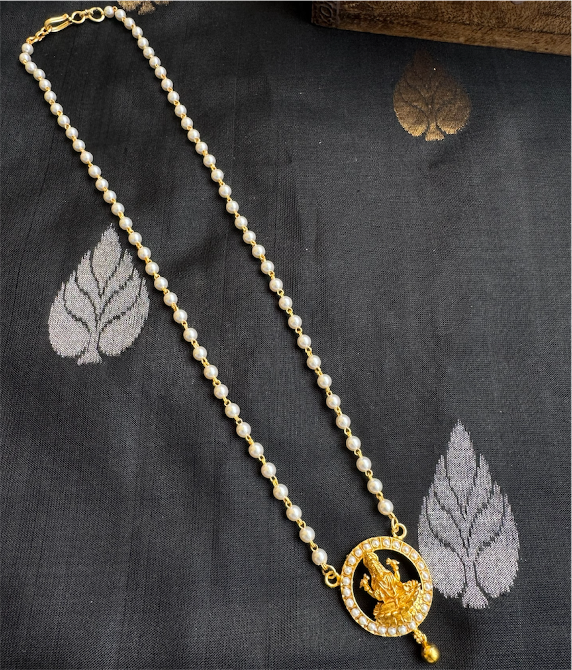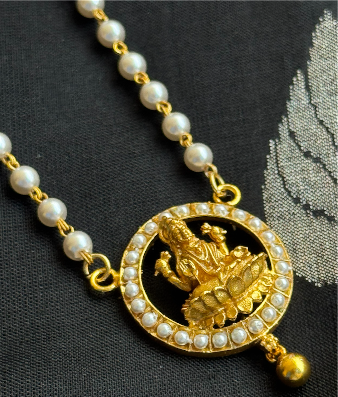 The necklace is gracefully accented with delicate pearls, creating a classic temple-inspired look that is both regal and refined. Perfectly balancing tradition with versatility, this piece pairs effortlessly with ethnic attire, festive wear, or even contemporary outfits for a statement of understated luxury. The set is completed with matching Lakshmi motif earrings, making it an ideal choice for weddings, celebrations, and special occasions.