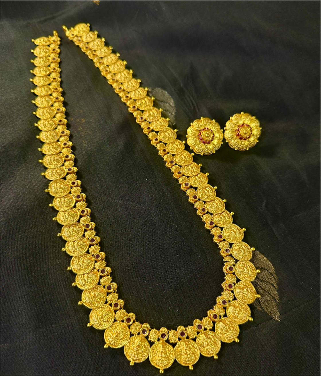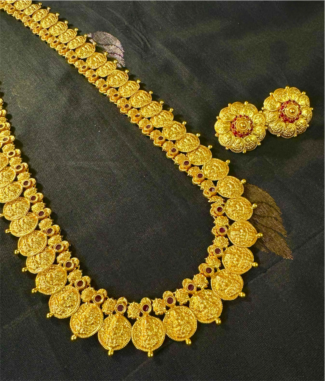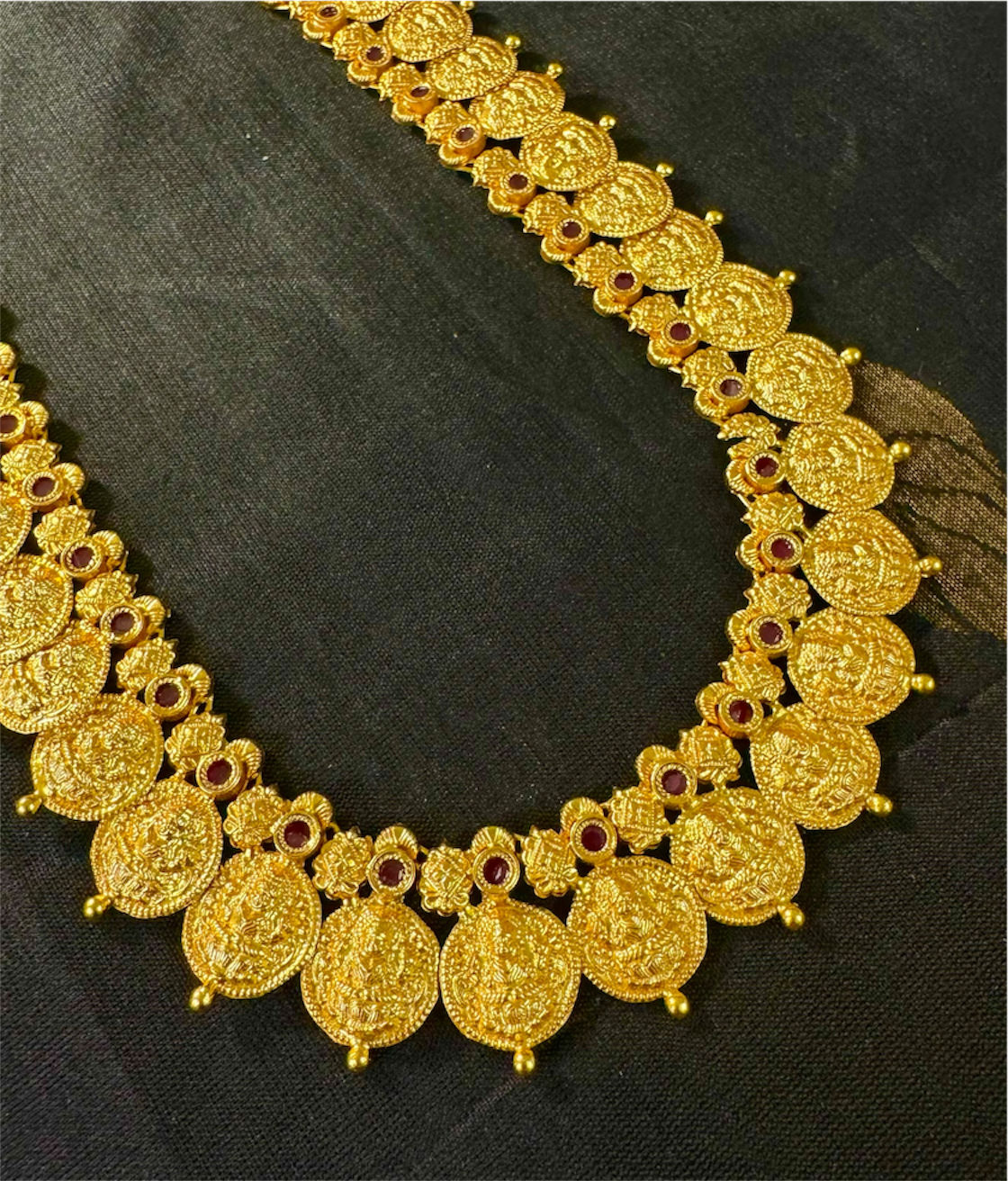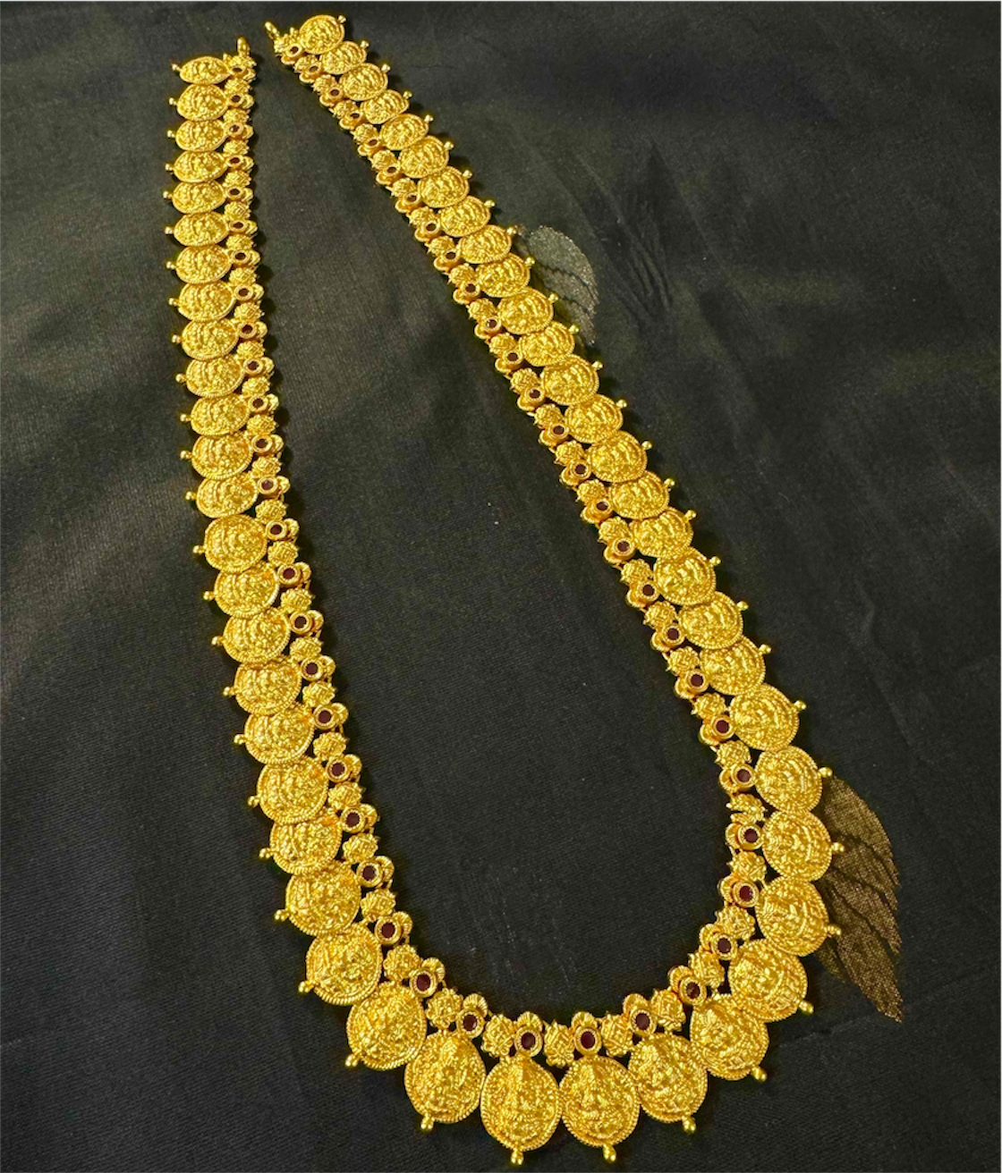 An iconic design, this traditional `Kasu malai' is a rare masterpiece of jewellery that will be prized and passed on for generations. The coins carry the image of godess Laxmi (seated on a lotus) which is topped by a beautiful parrot motif that is studded with a single row of `kempu stones'. The skill and craftsmanship exhibited in this piece are truly amazing.This is a long necklace and can be used as a waist-belt also .