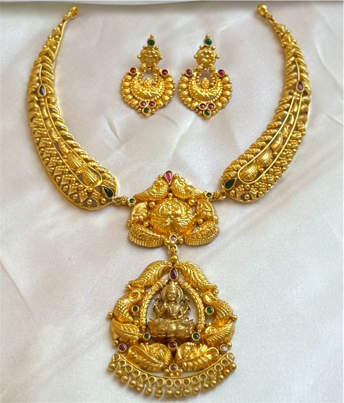 This exquisite necklace features a detailed Lakshmi motif at the centre, symbolising prosperity, grace, and divine abundance. Surrounding the goddess is an elegant peacock-themed border, meticulously carved to highlight the beauty of flowing feathers and traditional temple artistry.