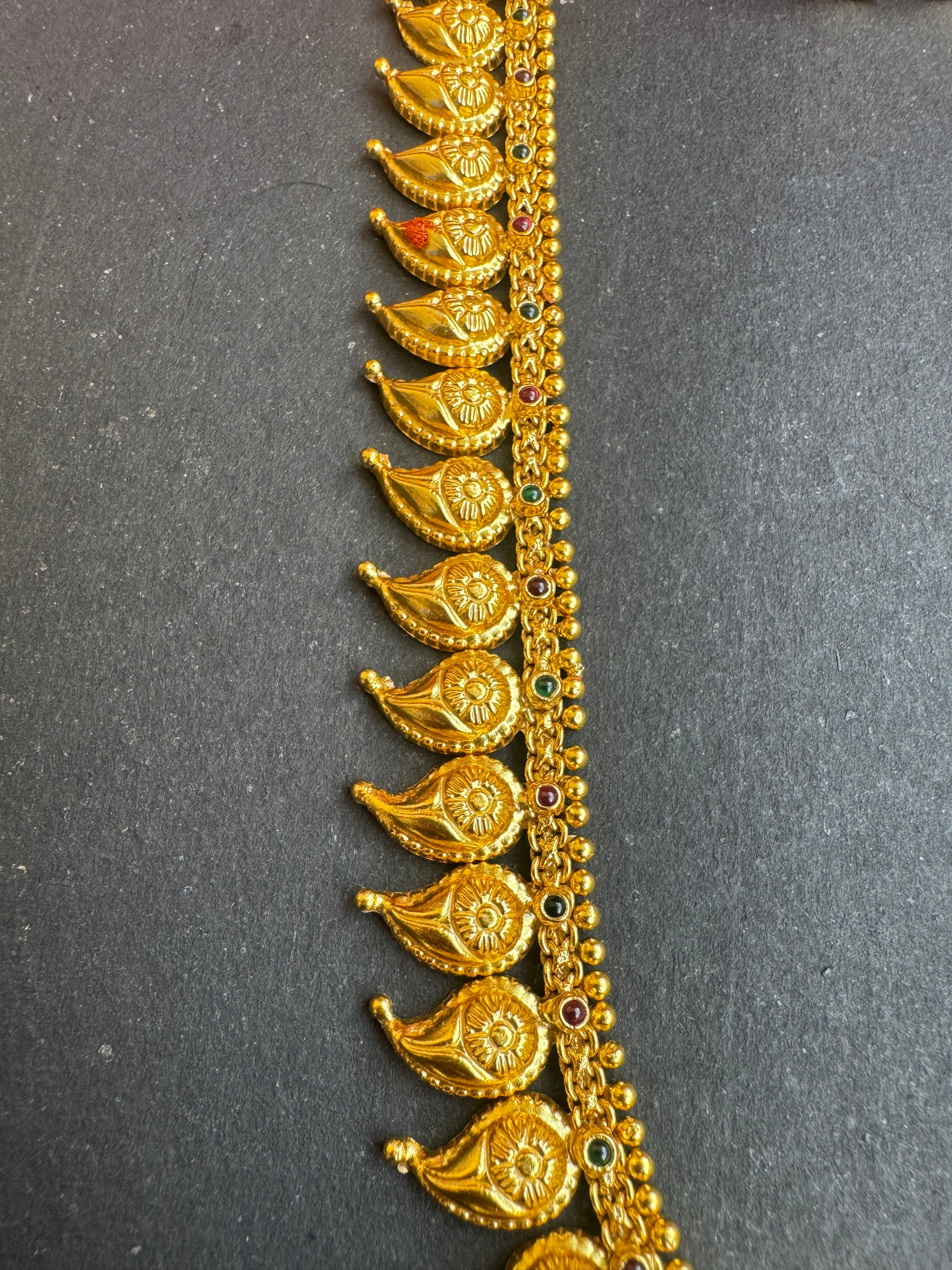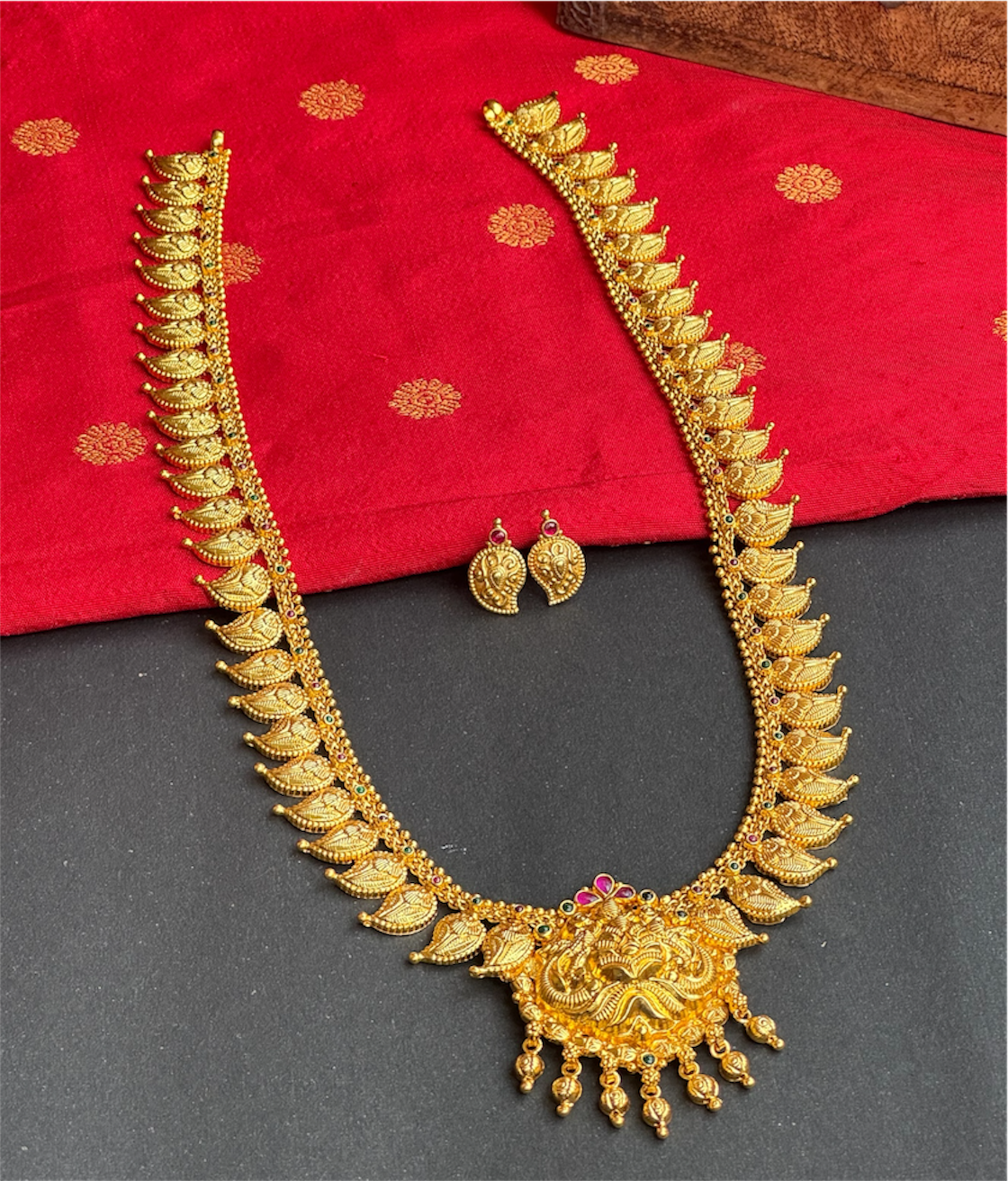 An exquisite temple-inspired haara, meticulously handcrafted in 92.5 sterling silver and enriched with 24K gold patterned detailing. The intricate nakkashi craftsmanship showcases flowing, feather-like motifs that echo the timeless elegance of classical South Indian artistry.