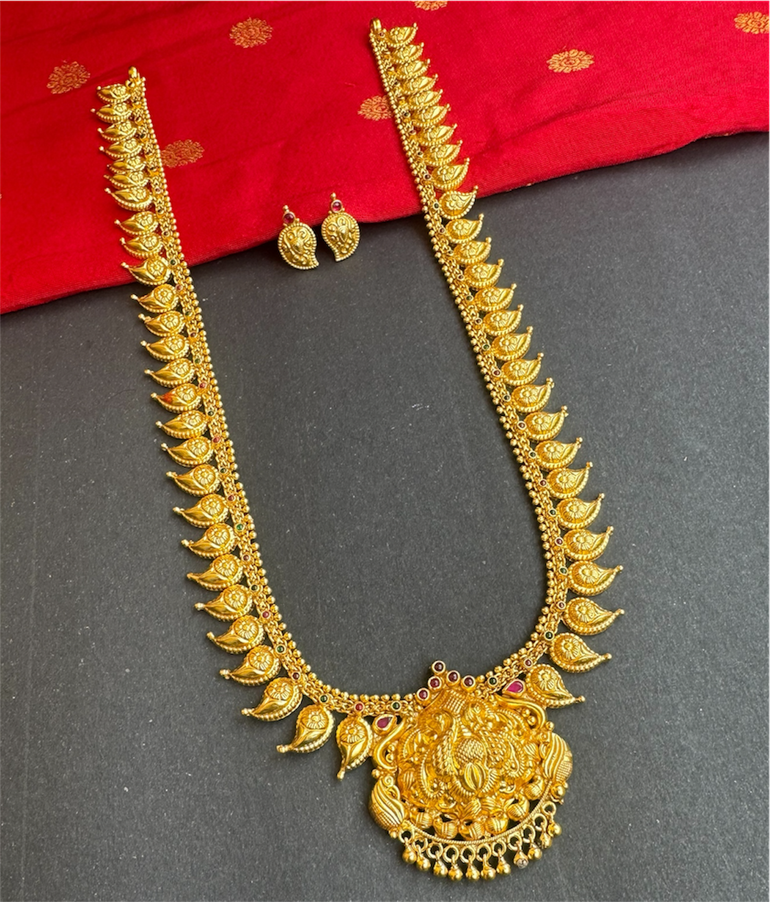 An exquisite temple-inspired haara, meticulously handcrafted in 92.5 sterling silver and enriched with 24K gold patterned detailing. The intricate nakkashi craftsmanship showcases flowing, feather-like motifs that echo the timeless elegance of classical South Indian artistry.