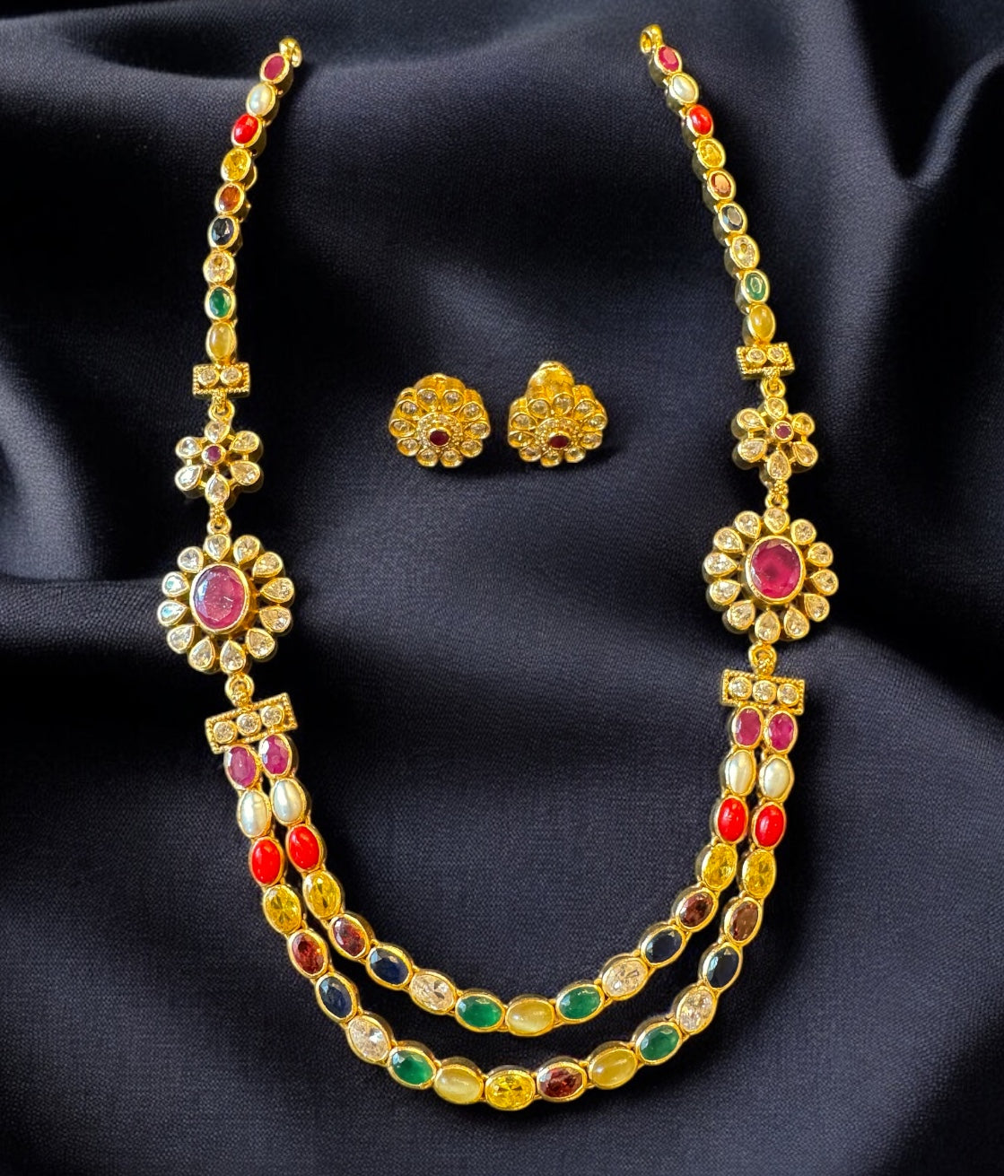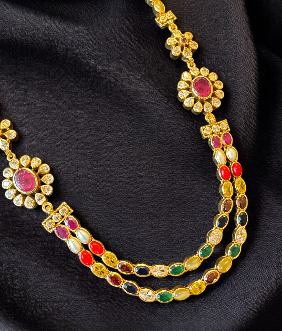 Gemstones used: Natural pearl, red powdered Coral, hessonite, blue sapphire, Cat's eye, yellow sapphire, Garnet, kempu stone (also known as spinel or Zircon),AAA+ Quality Cubic Zirconia.