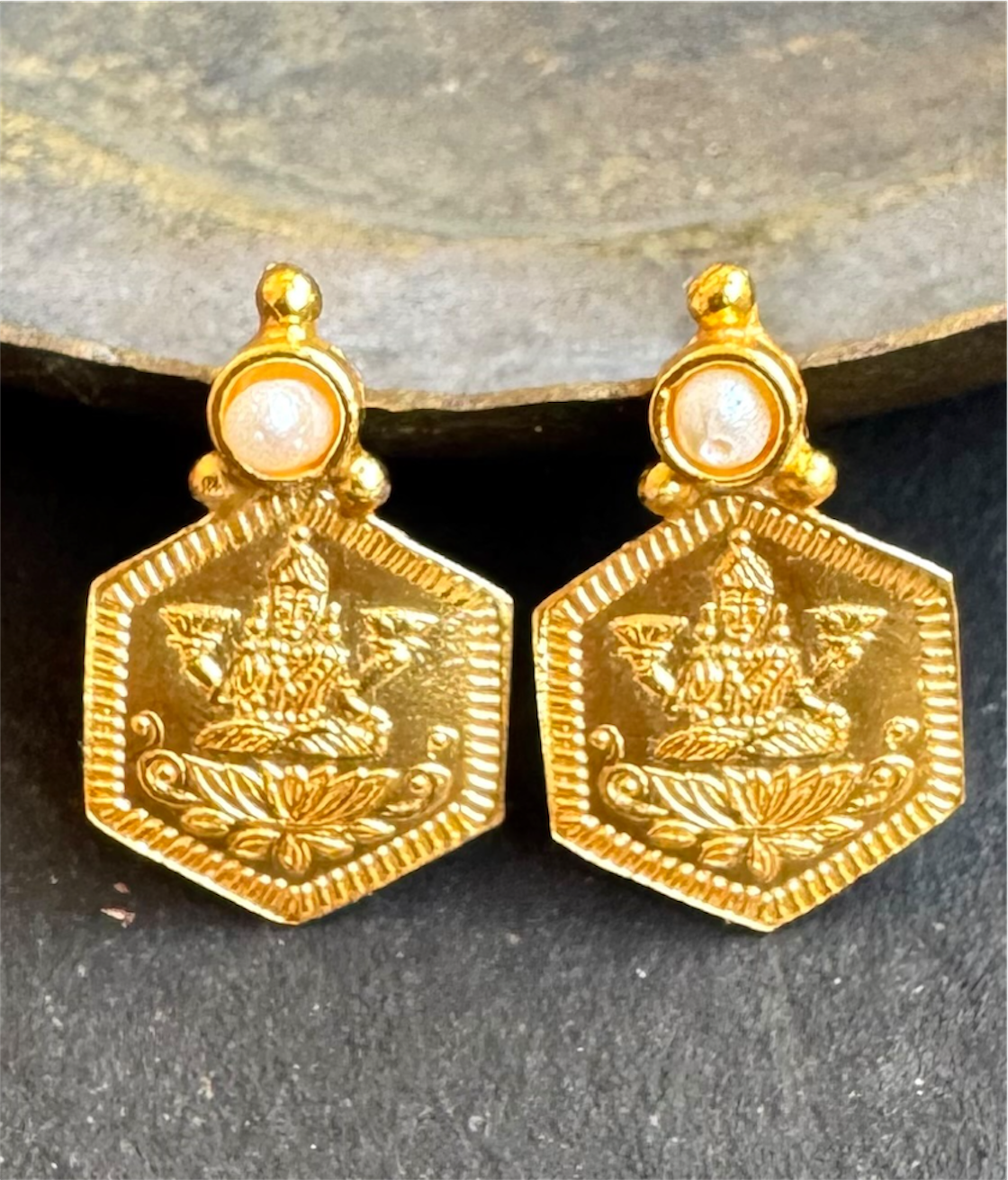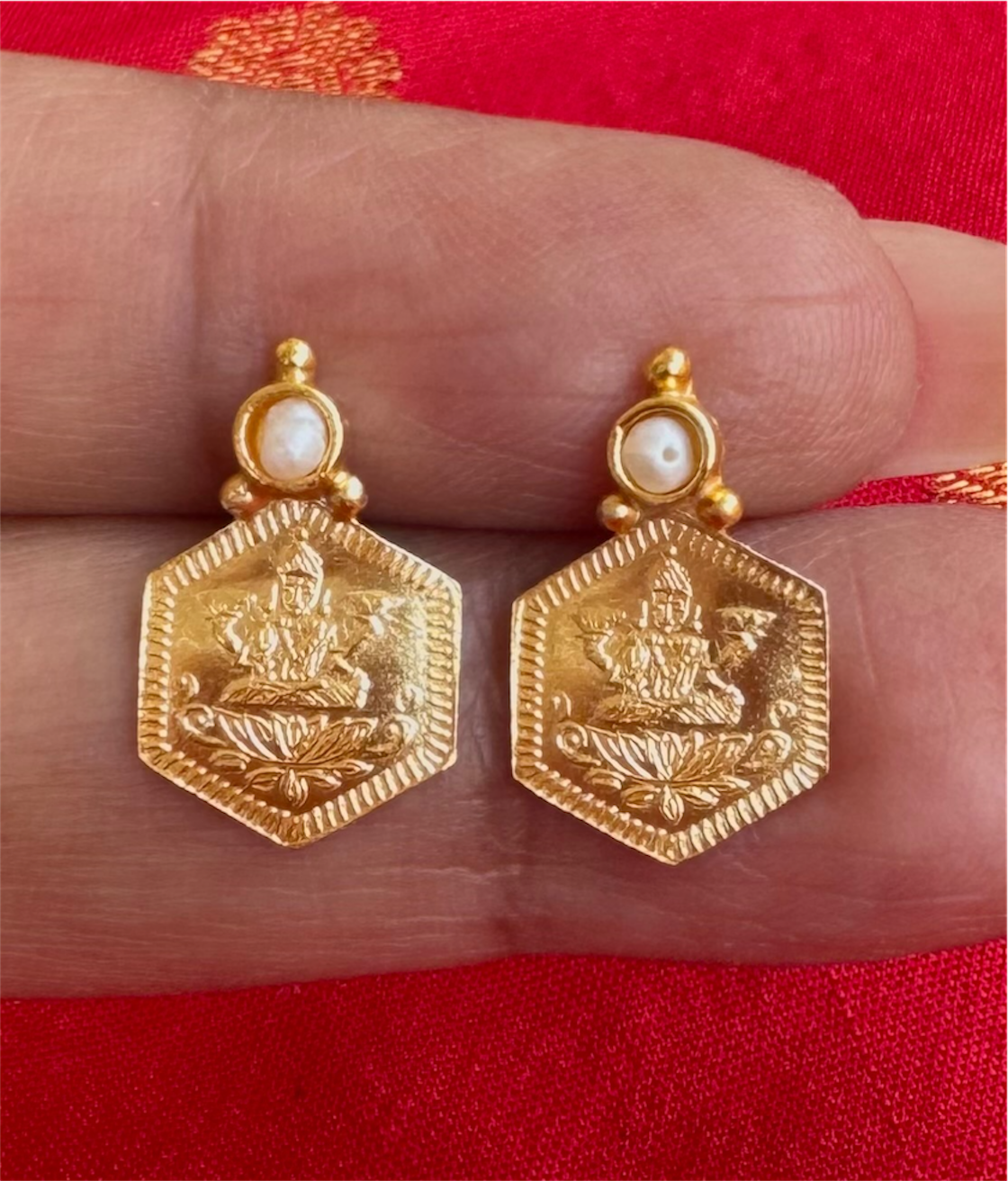 An iconic design rooted in heritage, these lightweight traditional Kasu earrings are exquisitely handcrafted in 92.5 Sterling Silver. Featuring antique-style unique hexagon shaped, gold-dipped silver coins ,each earring bears the sacred image of Goddess Lakshmi seated on a lotus, symbolising prosperity and abundance, and is beautifully accented with a Pearl.
