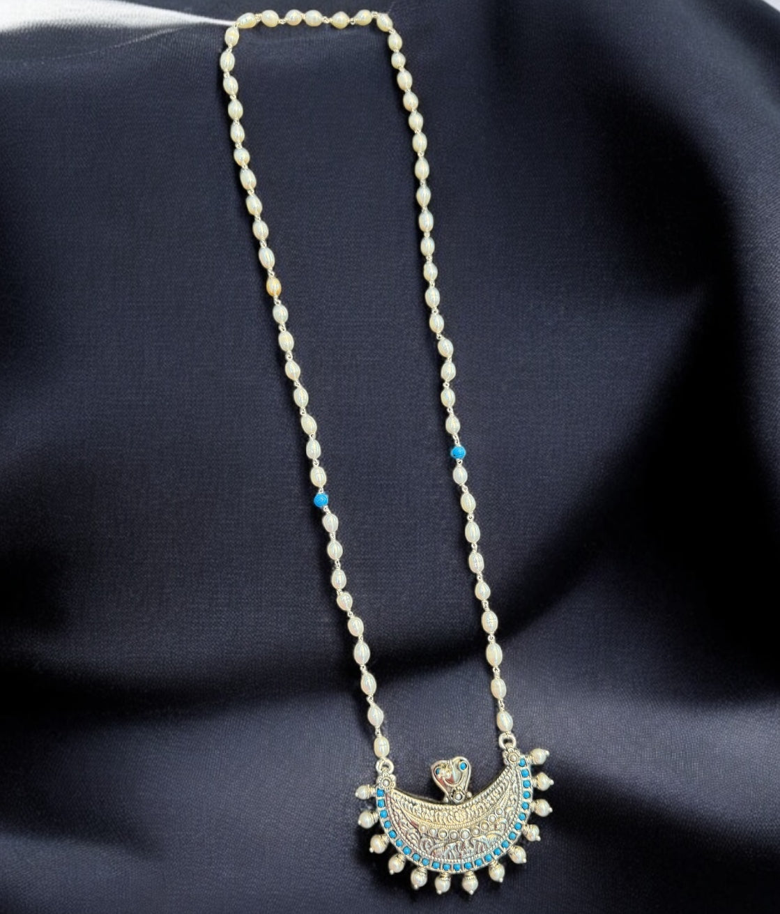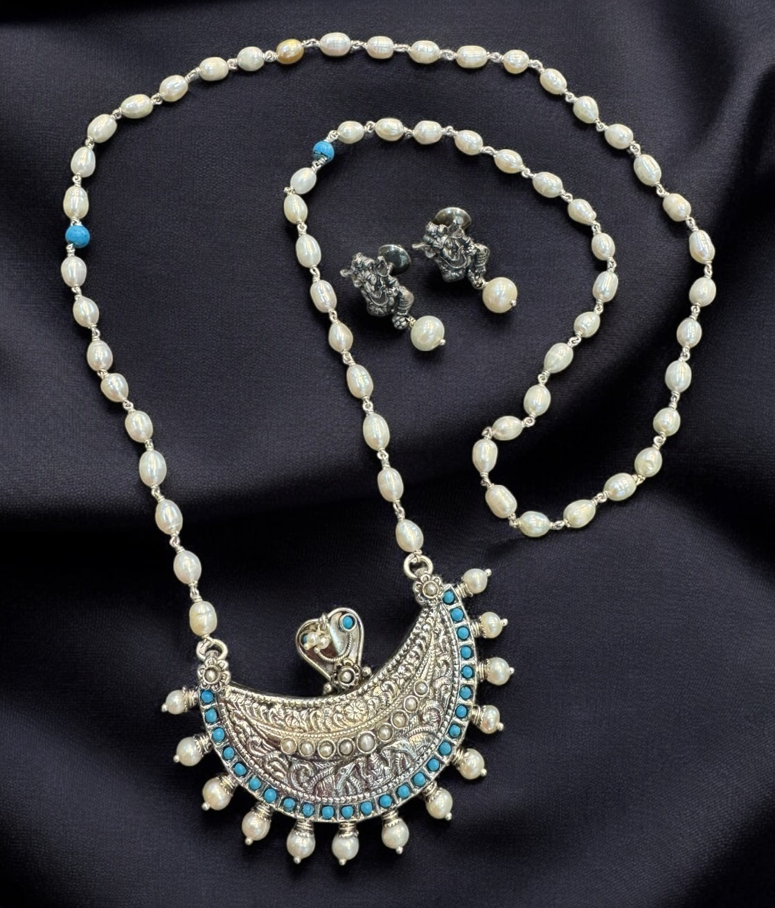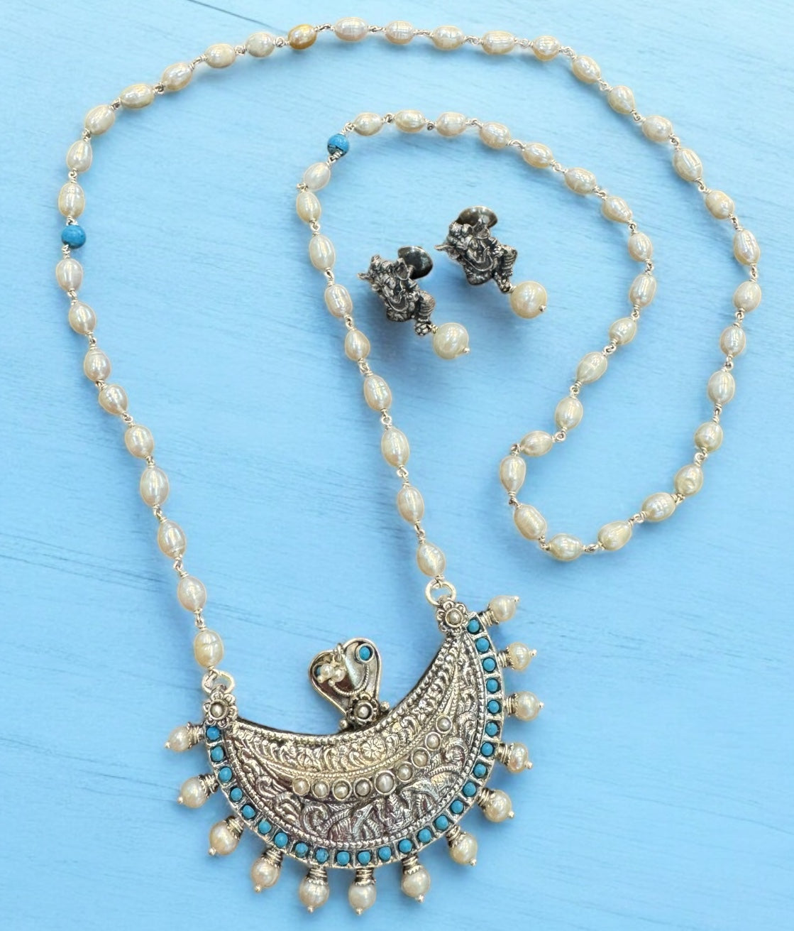 The Anavila Pearl & Turquoise Kokkethathi Silver Necklace & Earrings