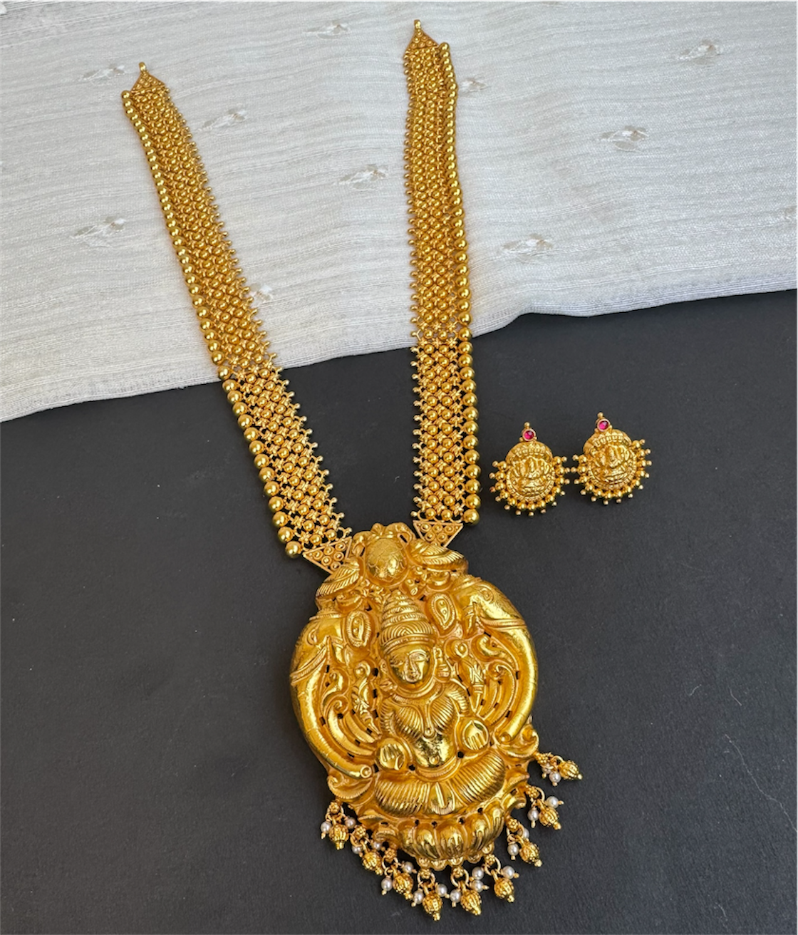 Handcrafted using techniques used in ancient South Indian antique jewellery and studded with tiny kempu stones it is gold-dipped in a special process to give an antique look.
