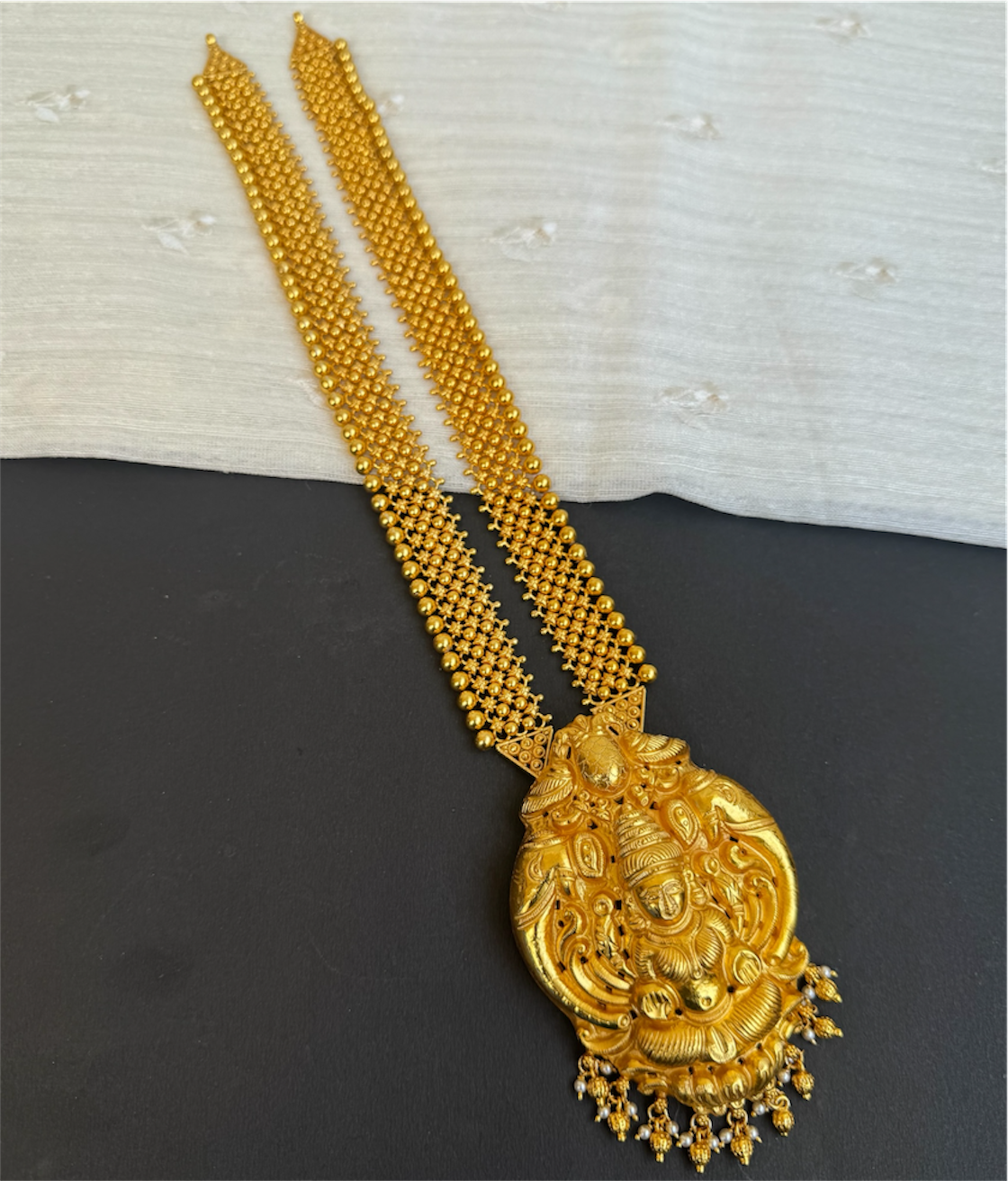 Let the beauty and grace of the peacock surround you with this gorgeous and long Sterling Silver (92.5%) necklace handcrafted with nakshi or nakkasi work.The necklace string is made up of a row of peacocks while the pendant carries the image of goddess Lakshmi.