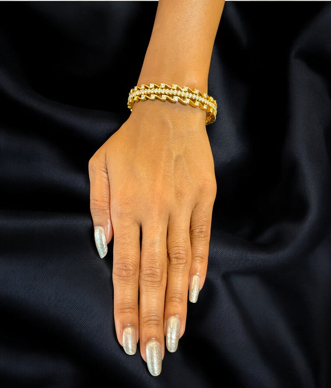 The bangle uses AAA+ Quality Cubic Zircon that gives it a sparkling shine. Handcrafted in Sterling Silver (92.5%) in a flawless pattern to mesmerise and awe us with its intricacies of design and flawless craftsmanship and gold-dipped in a special process . This seamlessly handcrafted bangle can be bought as a single piece or in a pair. The price listed is for a single bangle.