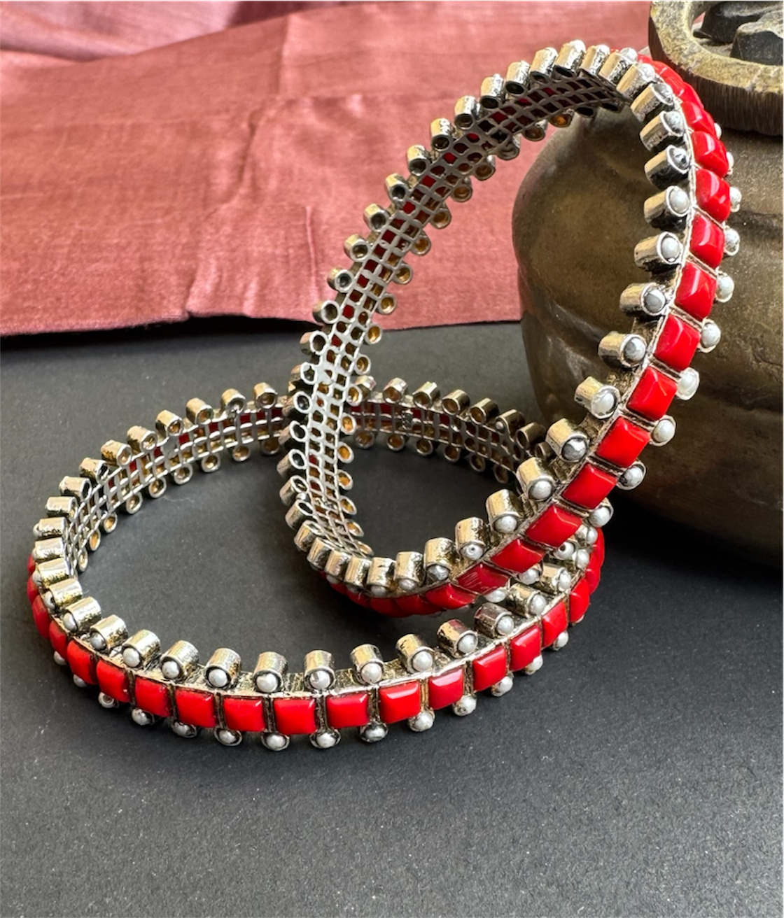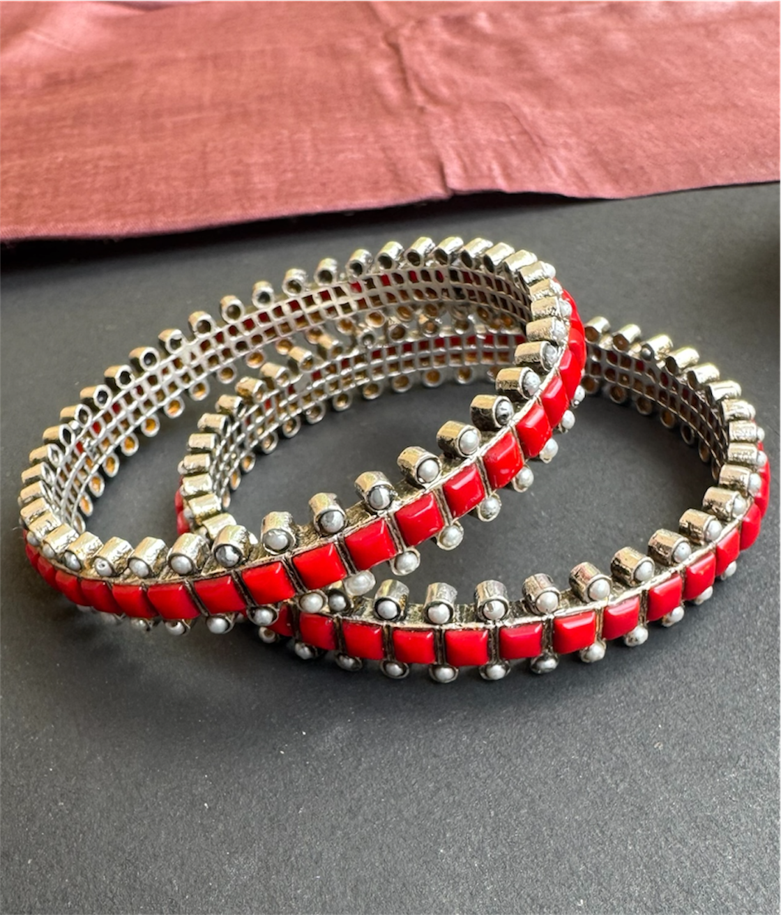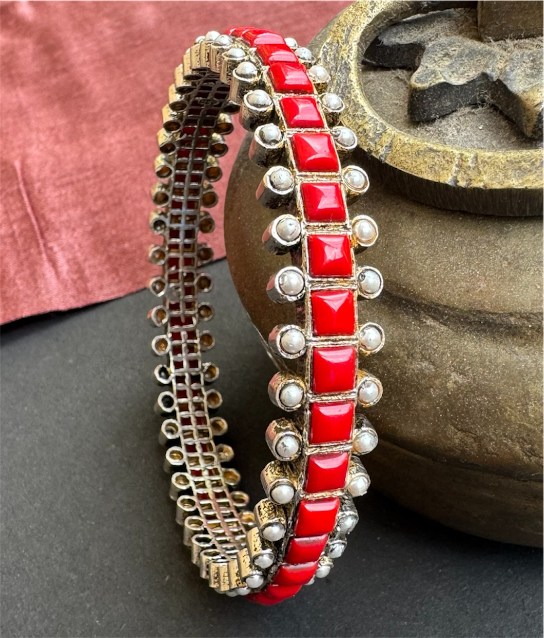 The Rajanya Silver Coral&Pearl Bangle (Oxidised/Size 2.2/2.4/2.6/2.8) - KO Jewellery