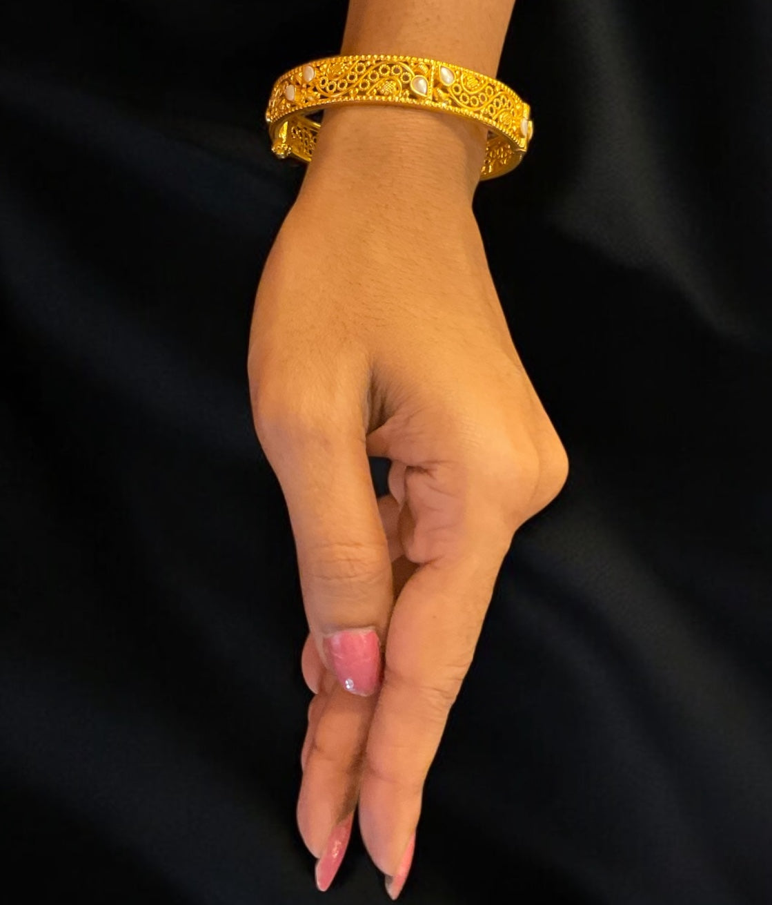 This gorgeous kada , crafted from high-quality 92.5% sterling silver and dipped in 24 K gold, features an intricate filigree design which is further adorned with lustrous pearl that makes it look dreamy .