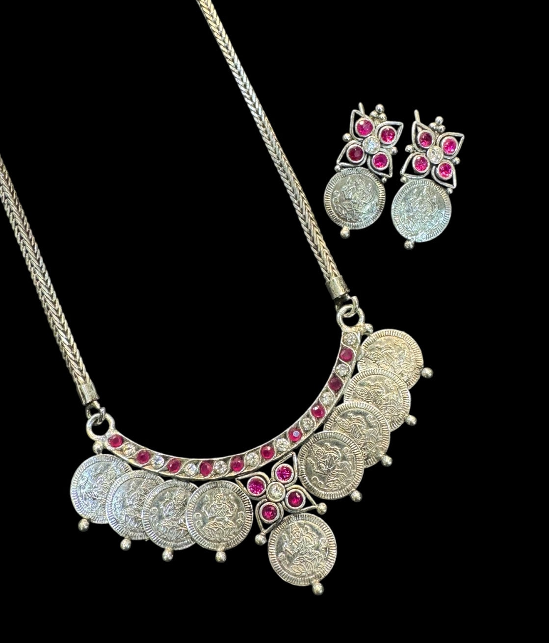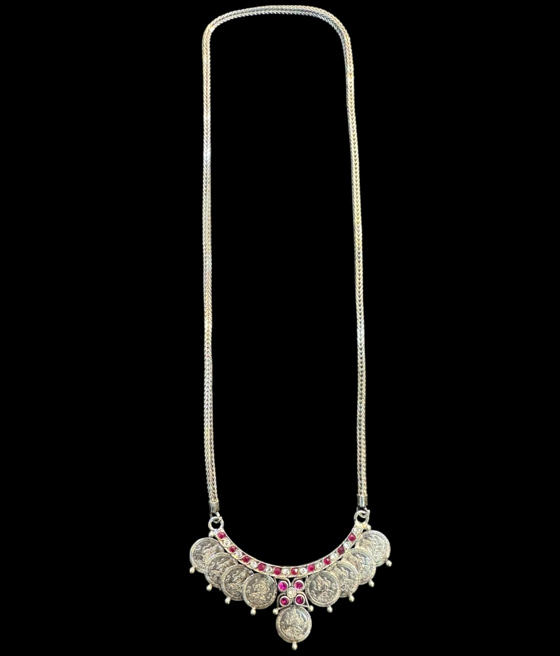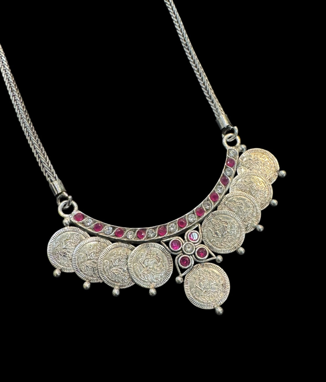 Crafted in pure 92.5 Sterling Silver, this necklace is a fine tribute to traditional South Indian temple artistry. The intricate kasu mala design—composed of antique-style silver coins—adds texture, movement, and historical richness, while the kemp stones evoke an aura of regal grandeur.