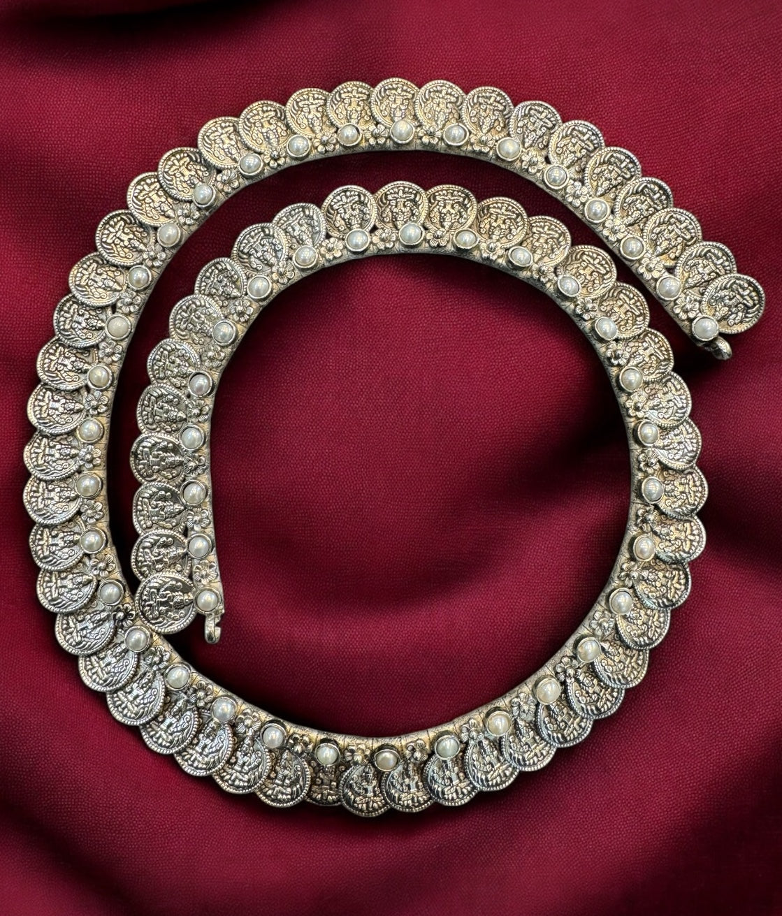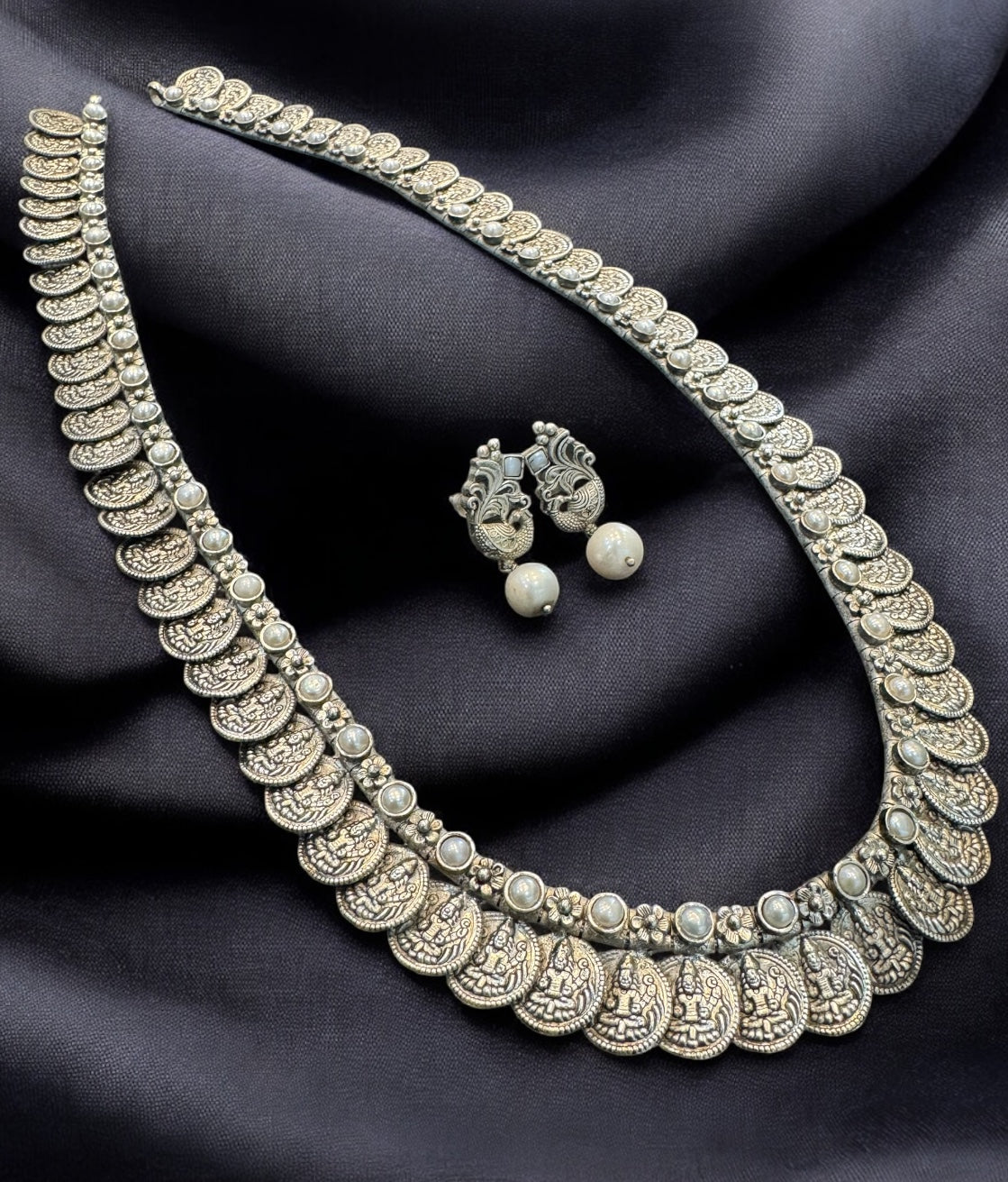 Crafted in pure 92.5 Sterling Silver, this necklace is a fine tribute to traditional South Indian temple artistry. The intricate kasu mala design—composed of antique-style silver coins—adds texture, movement, and historical richness, while the premium Pearls evoke an aura of regal grandeur.