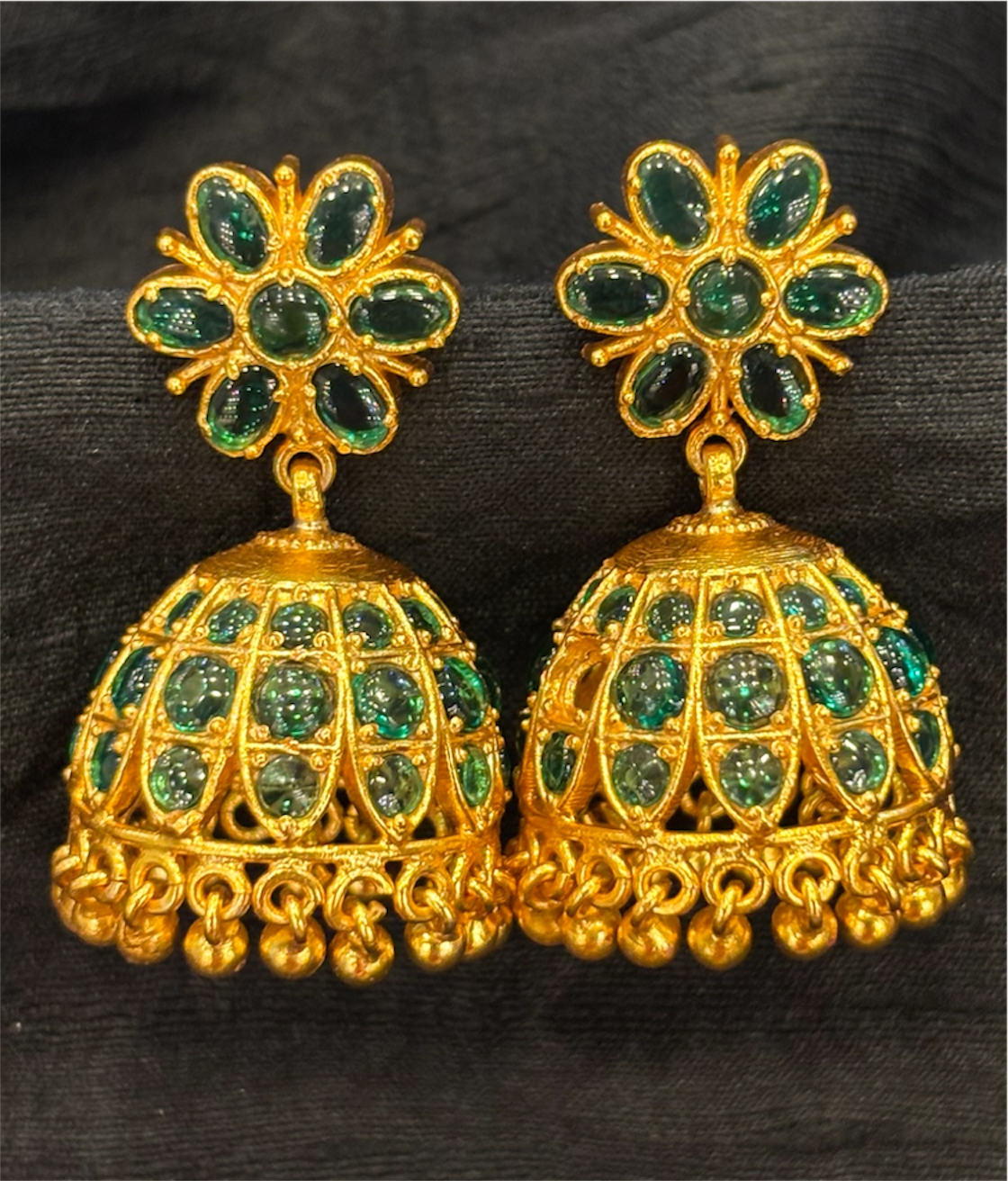 Crafted in 92.5 silver and dipped in 24k gold, this jhumka embodies the beauty of traditional South Indian design. The vibrant green kemp stones add a regal touch, celebrating the depth and colour of age-old craftsmanship.