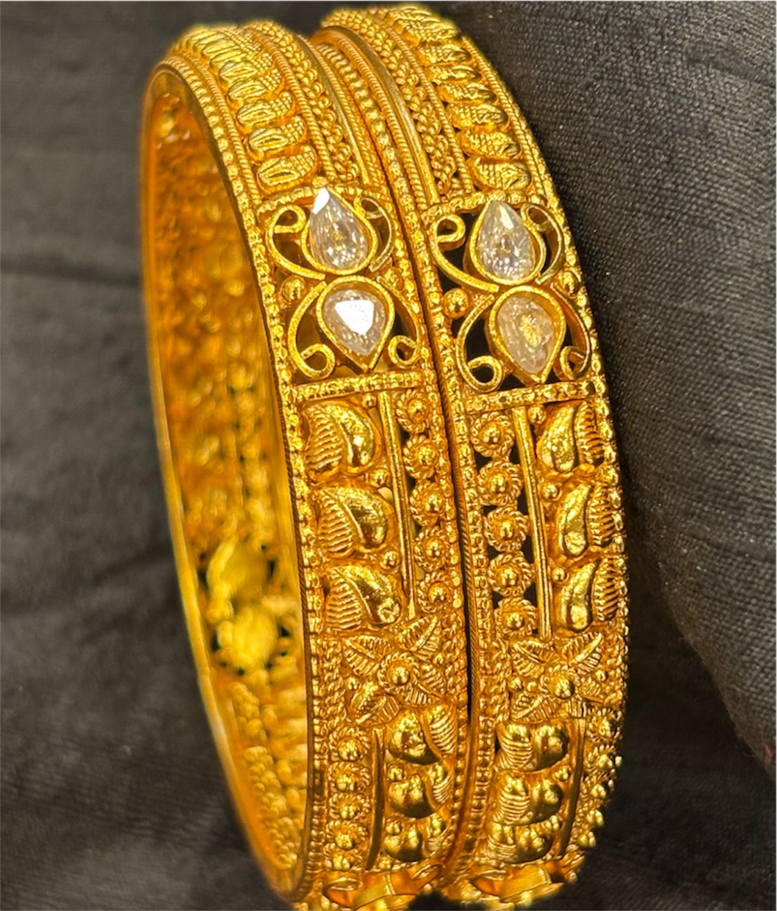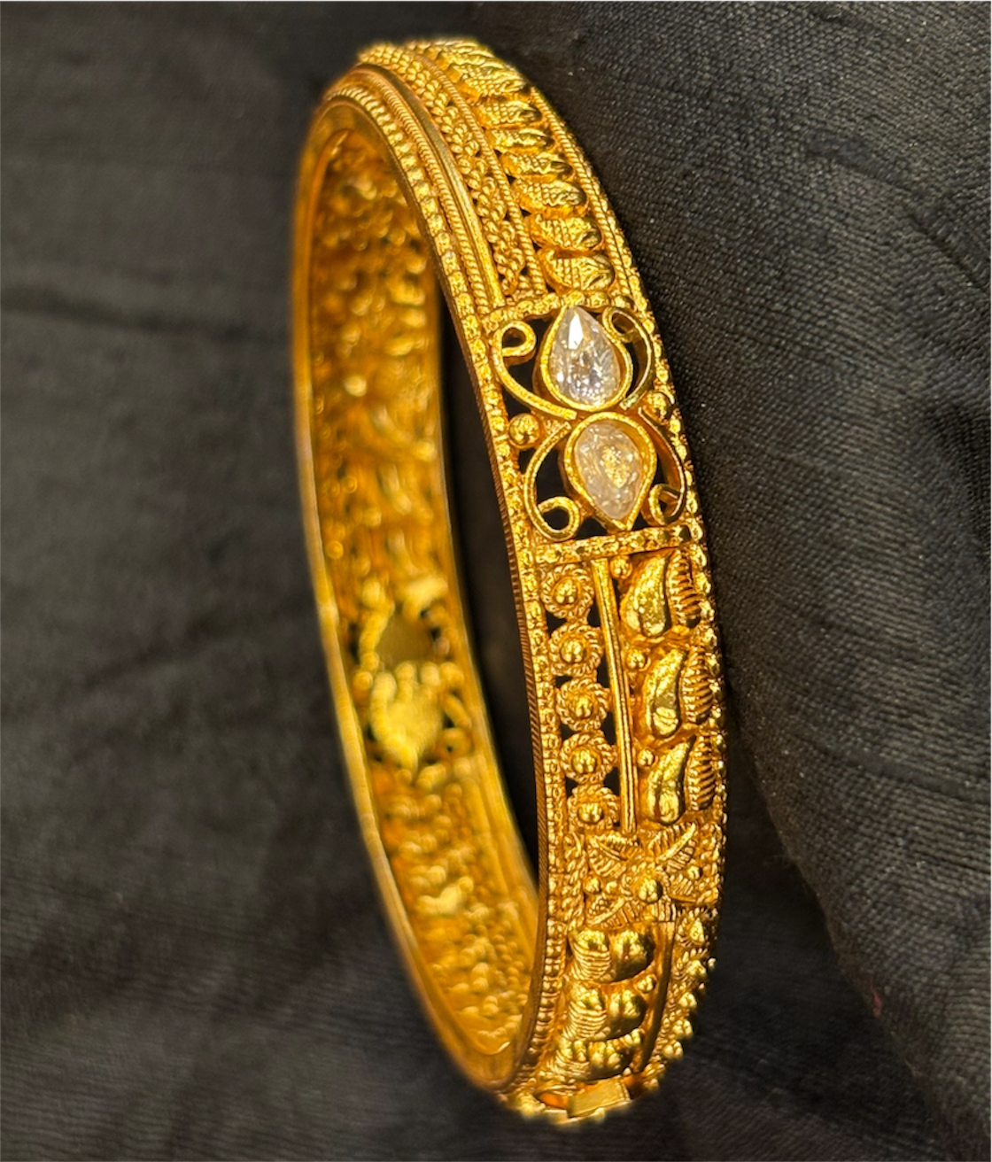 The bangle features an ornate filigree pattern inspired by timeless Indian jewellery traditions, lending it a regal and sophisticated character. Each swirl and motif is patiently shaped by skilled artisans, resulting in a design that feels both intricate and effortlessly elegant.