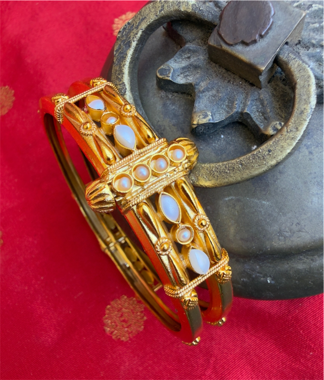Intricate detailing paired with tiny natural pearls makes this bracelet an irresistible accessory. A signature design of Kodava traditional jewellery, it is meticulously handcrafted in Sterling Silver (92.5%) using age-old South Indian antique jewellery techniques. The bracelet is gold-dipped through a special process to achieve an authentic antique finish. Designed as a kada with a concealed screw mechanism, it can be easily opened and secured for a comfortable fit.