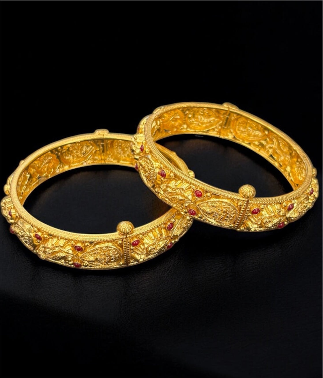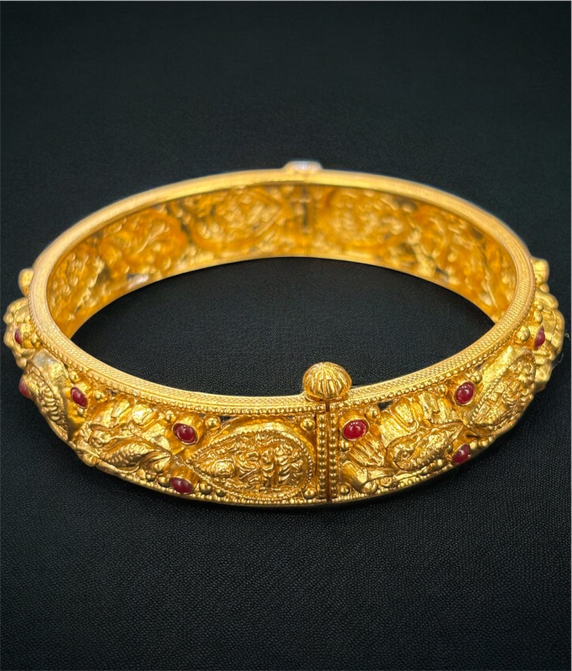 Each openable kada showcases a finely carved Lakshmi motif, representing prosperity, protection, and divine grace, while intricate kemp stones and elegant peacock designs add colour, richness, and traditional South Indian artistry.