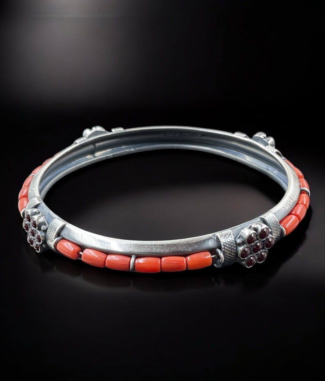 We have reinterpreted traditional designs to bring you these stunning bangles. Crafted in 92.5 Sterling Silver, this exquisite bangle showcases intricate detailing inspired by traditional South Indian antique jewelry. Adorned with lustrous pearls and Coral it exudes timeless elegance. Handcrafted with precision, it is oxidised to achieve an antique finish. This bangle is both versatile and easy to wear, making it a perfect addition to your heritage jewelry collection.