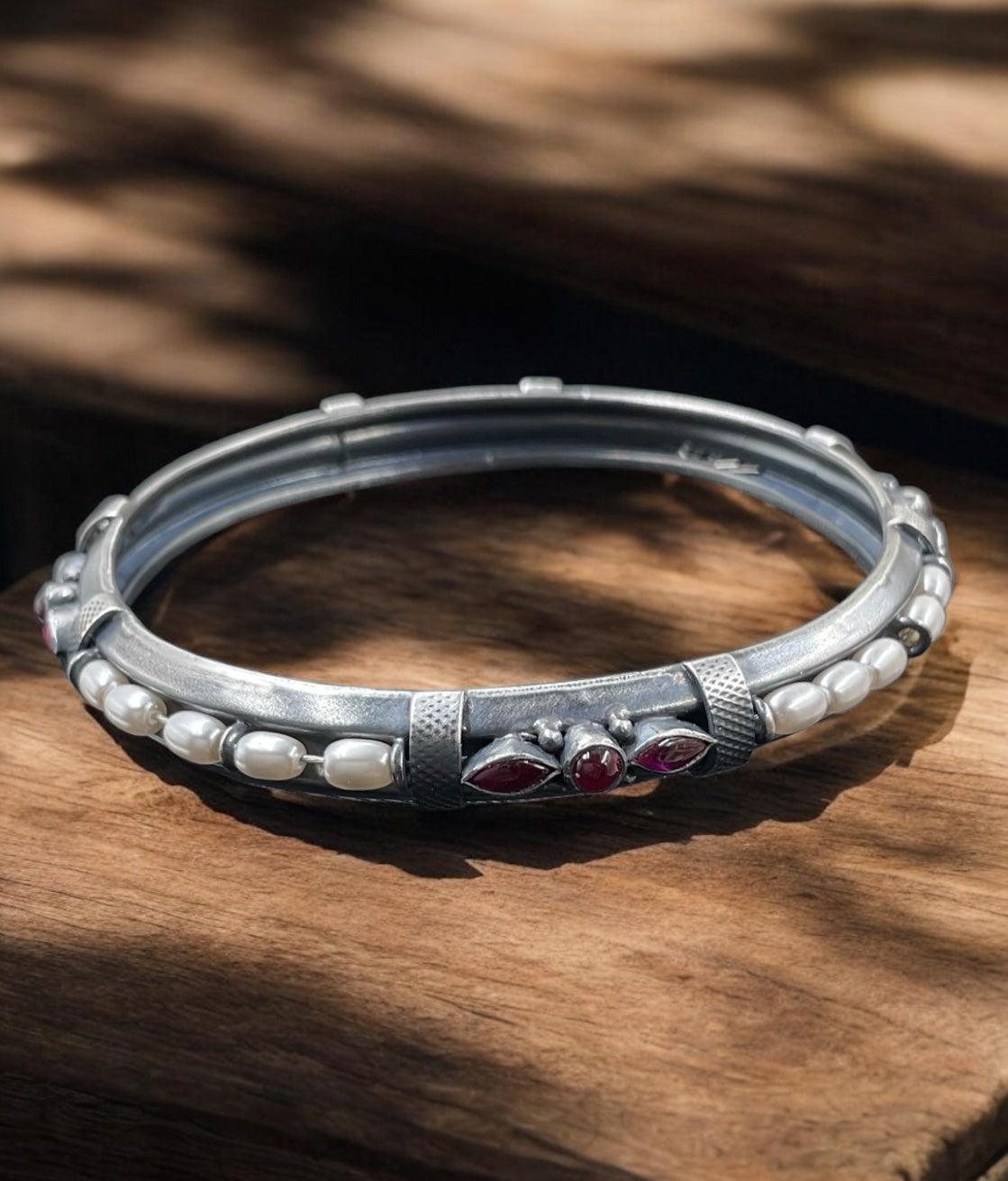 We have reinterpreted traditional designs to bring you these stunning bangles. Crafted in 92.5 Sterling Silver, this exquisite bangle showcases intricate detailing inspired by traditional South Indian antique jewelry. Adorned with lustrous pearls and kemp stone it exudes timeless elegance. Handcrafted with precision, it is oxidised to achieve an antique finish. This bangle is both versatile and easy to wear, making it a perfect addition to your heritage jewelry collection.