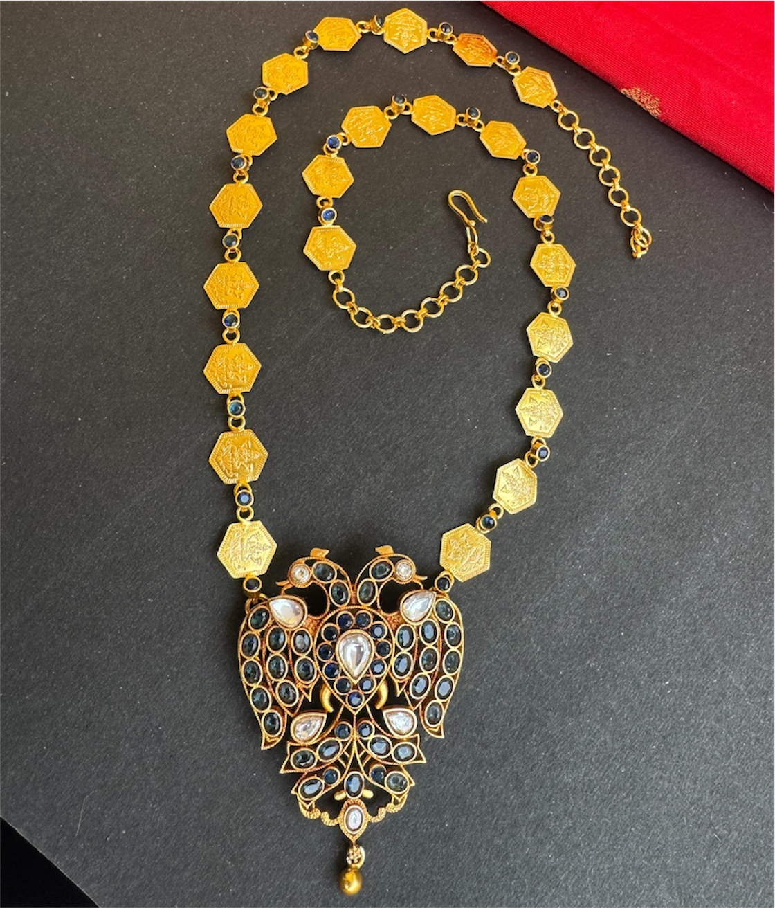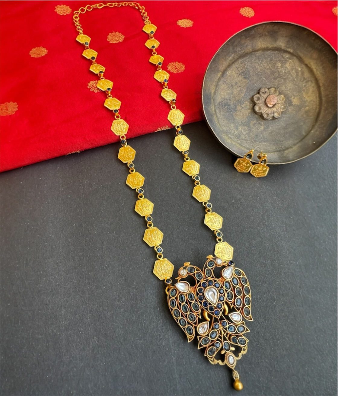 The intricate detailing, traditional motifs and flawless craftsmanship make it a standout temple jewellery piece—grand enough for special occasions yet versatile for contemporary styling.