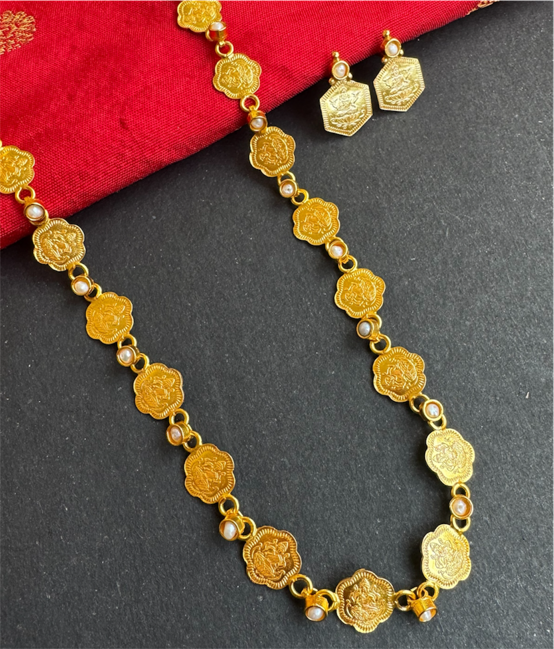 Lightweight Kasu Mala Necklace with Goddess Lakshmi & Natural Pearls