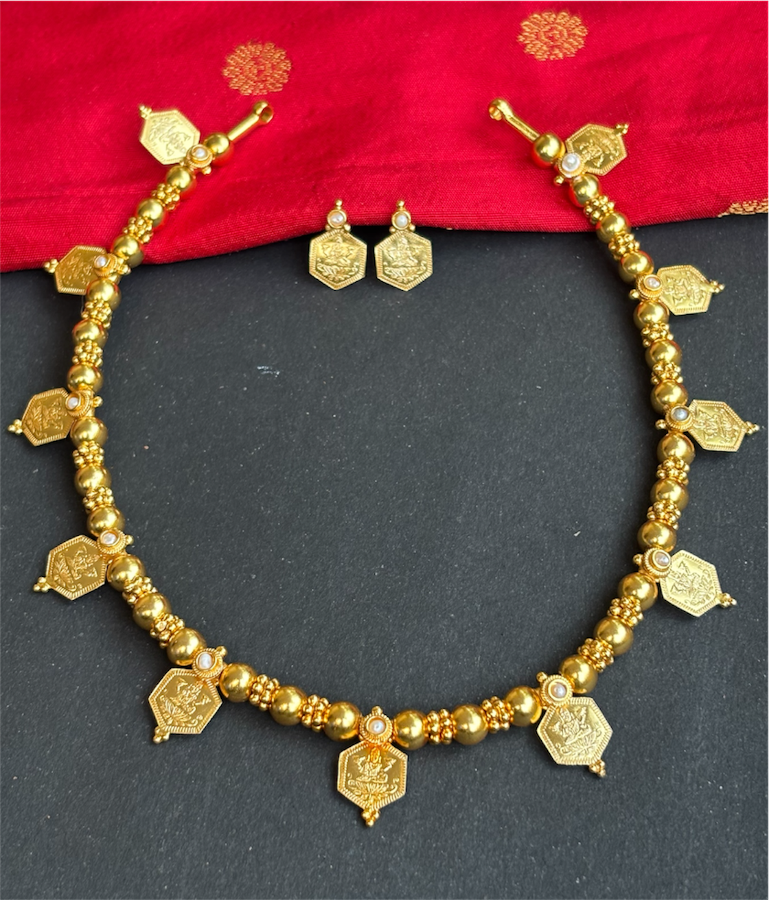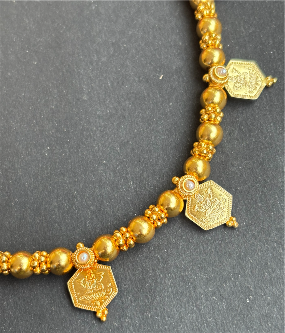 The Saumika Antique Silver Pearl Lakshmi Kasumala Coin Necklace & Earrings (gold dipped) - KO Jewellery