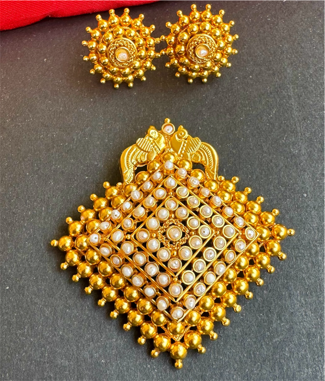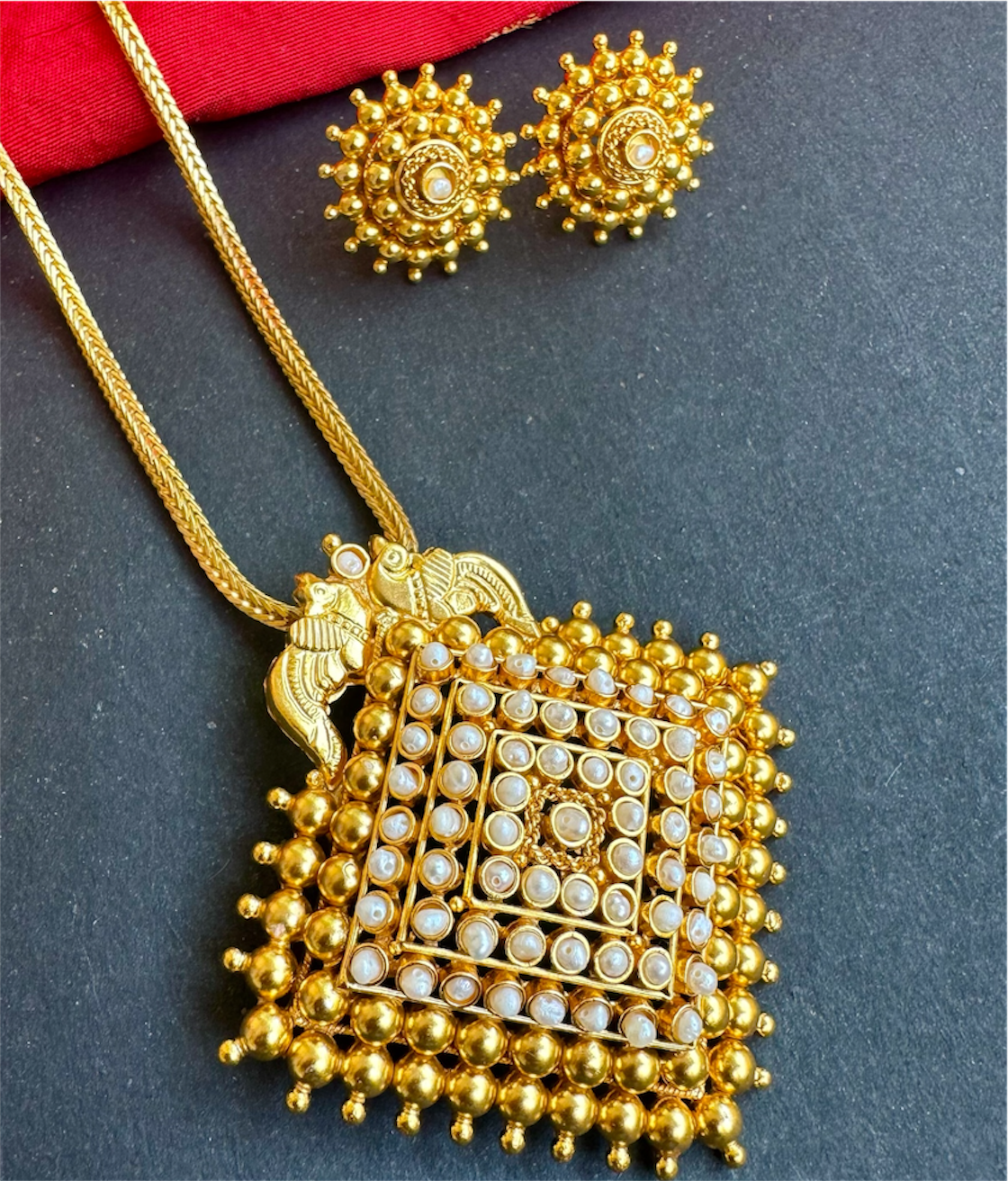 Ornate and exquisitely detailed, this pendant-and-earrings set is a versatile statement piece designed to complement sarees and traditional ethnic attire with effortless elegance. The set features an intricately crafted square-shaped pendant, crowned with twin peacocks—symbols of grace and beauty—and richly studded with premium natural cultured pearl .