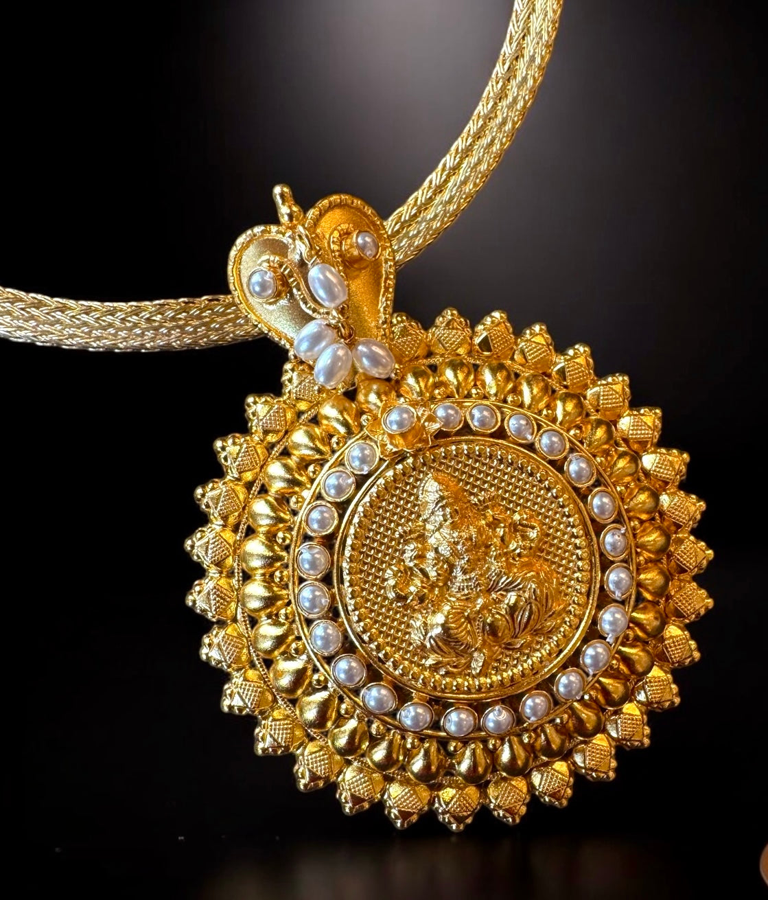 The pendant is a masterpiece of craftsmanship. It features a traditional round shape, crowned with a stylized cobra hood, a powerful symbol of fertility and protection. The pendant is decorated with kemp stones adding a touch of vibrancy and elegance. At the heart of the pendant is the divine image of Goddess Lakshmi, embodying prosperity and blessings.