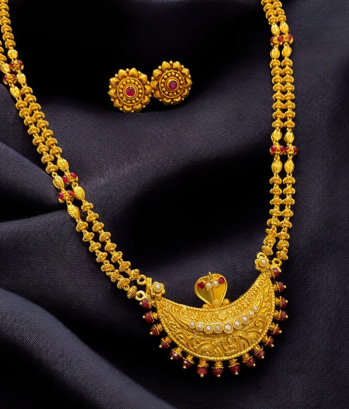 Crafted from high-quality 925 sterling silver, it is luxuriously dipped in 24K gold, giving it a radiant, timeless sheen that enhances its regal appeal. The intricate detailing and the traditional craftsmanship make this necklace a true heirloom to cherish for generations.