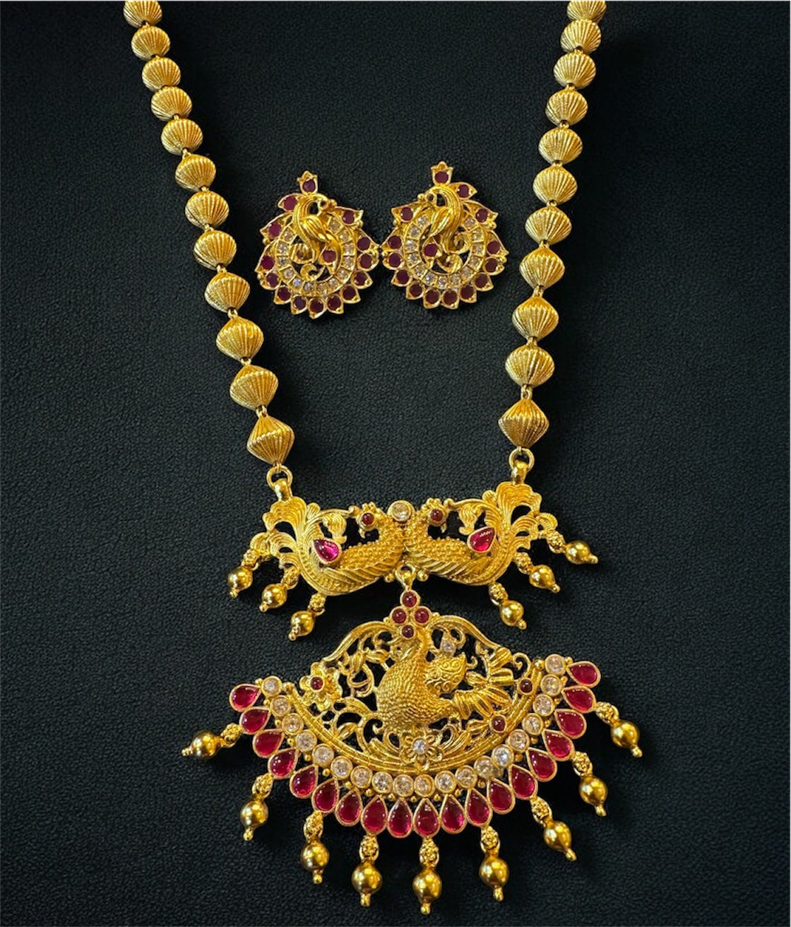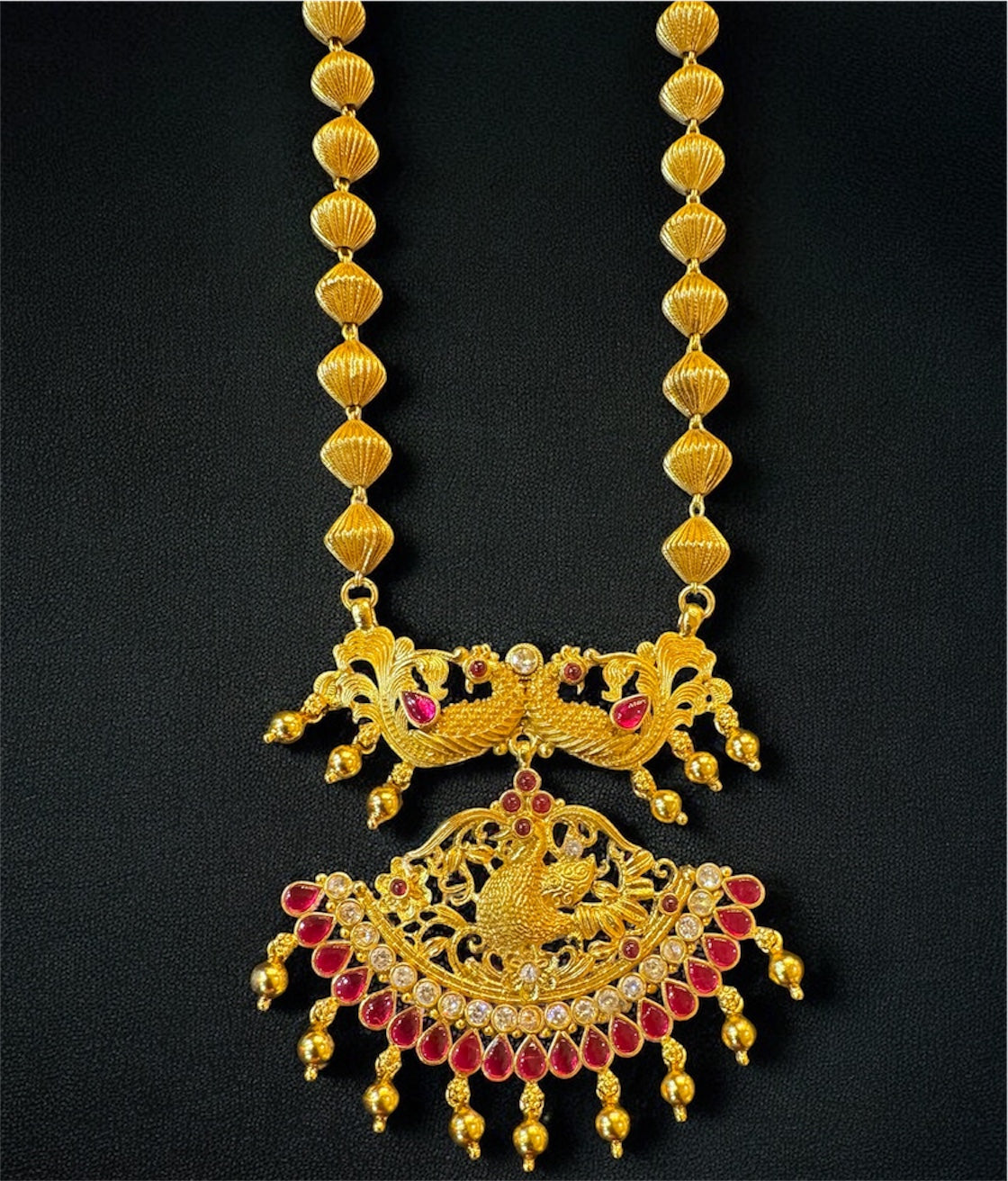 Embrace timeless elegance with this ornate peacock motif necklace, a stunning piece of traditional temple jewellery. The pendant, handcrafted from 92.5 sterling silver, features a graceful peacock design adorned with vibrant Kempu stones, symbolizing beauty and prosperity. The necklace string is made of gold-dipped silver beads arranged in an intricate pattern, enhancing its regal charm. Finished with a special antique gold dip, this masterpiece blends heritage artistry with enduring sophistication — perfect for festive and bridal occasions.