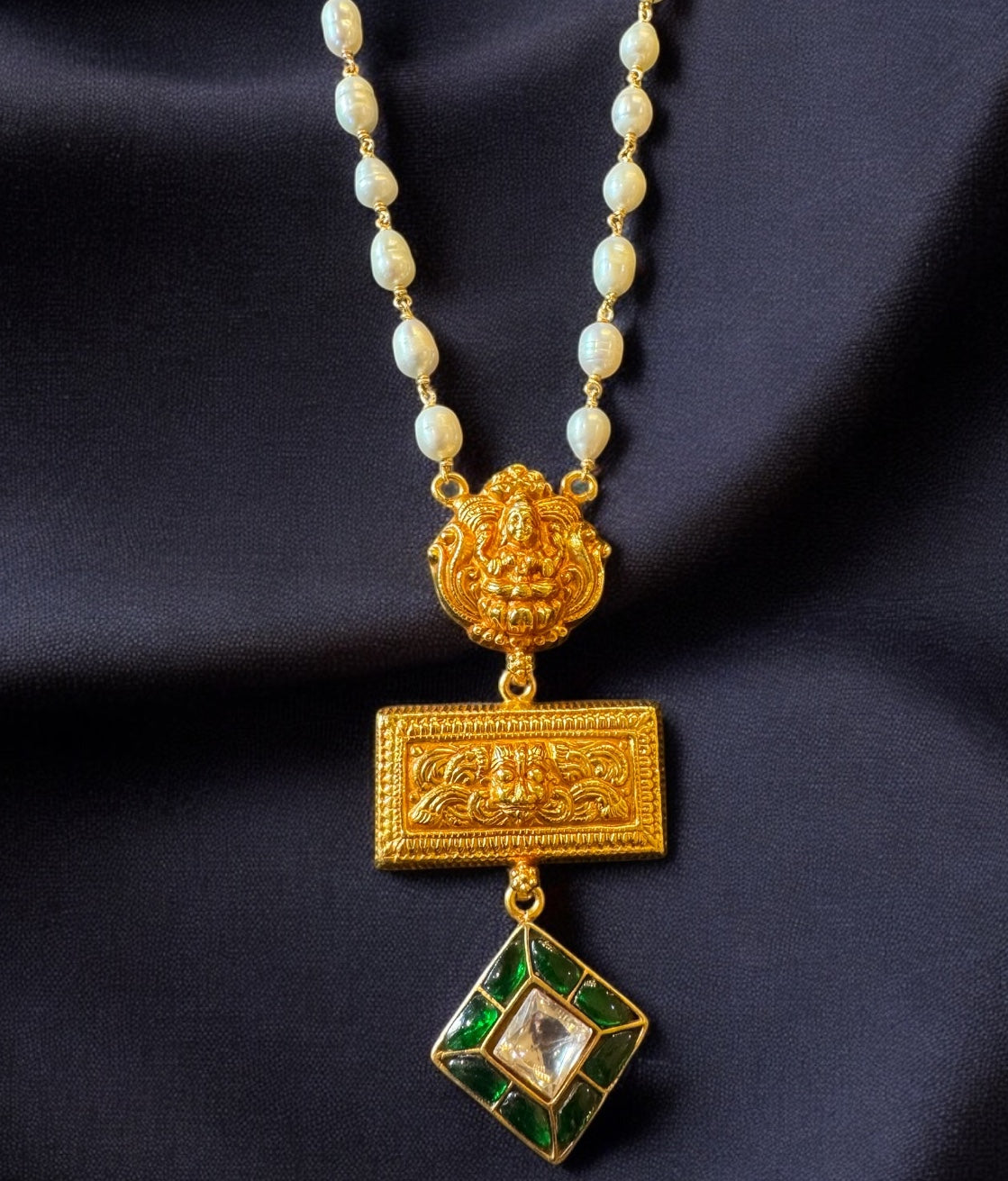 Suspended from a hand-strung chain of premium cultured freshwater pearls and silver wire, the necklace exudes antique charm with a contemporary sensibility. The necklace is gold dipped in 24 k gold to give an antique real gold look, echoing the grandeur of ancient South Indian gold temple jewellery while remaining a modern wearable heirloom.
