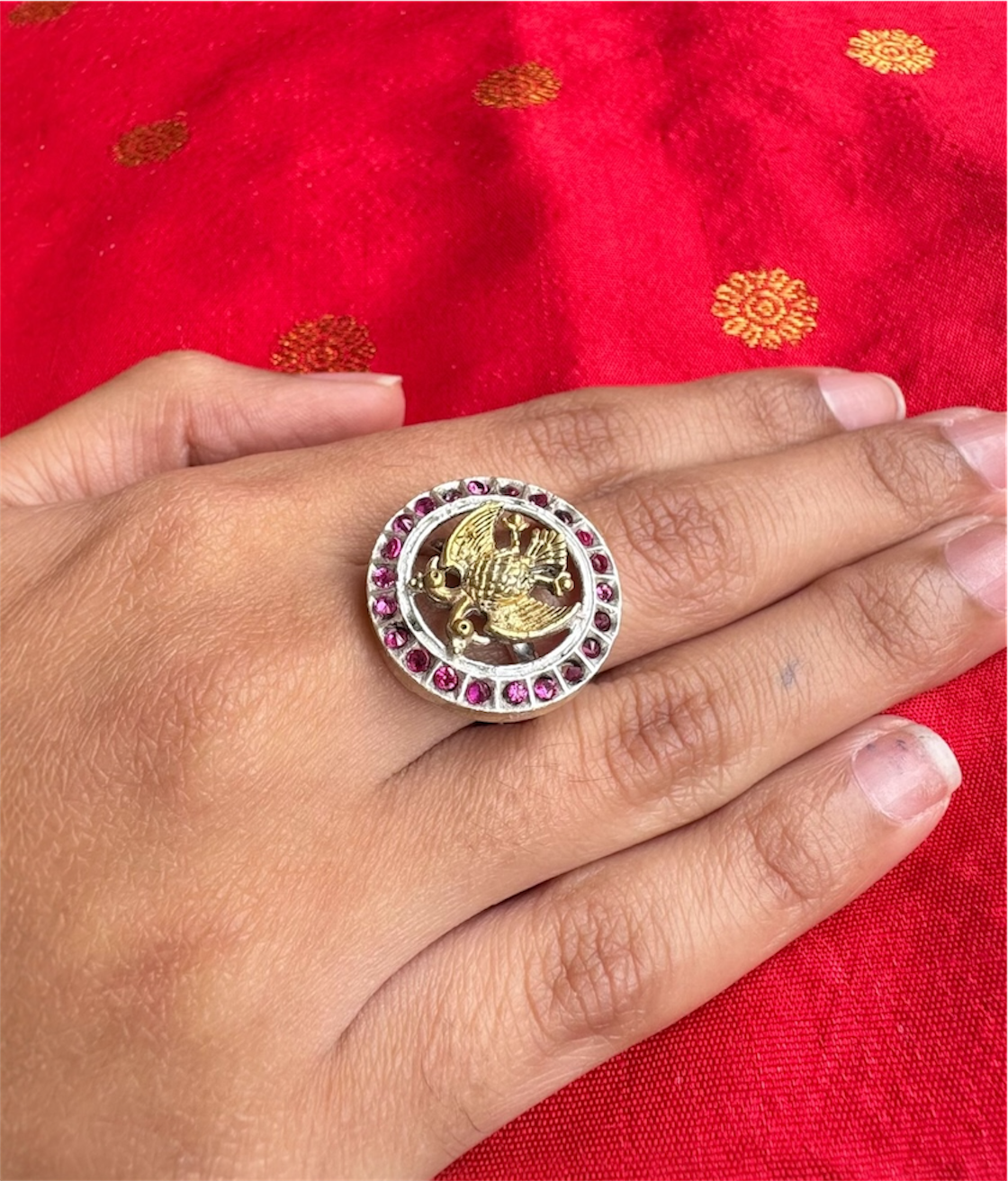 Handmade using the age-old techniques of temple jewelry, each piece is a testament to superior craftsmanship, created with care and dedication. Whether worn for a special occasion or as a daily statement piece, this ring is sure to captivate with its beauty and craftsmanship.