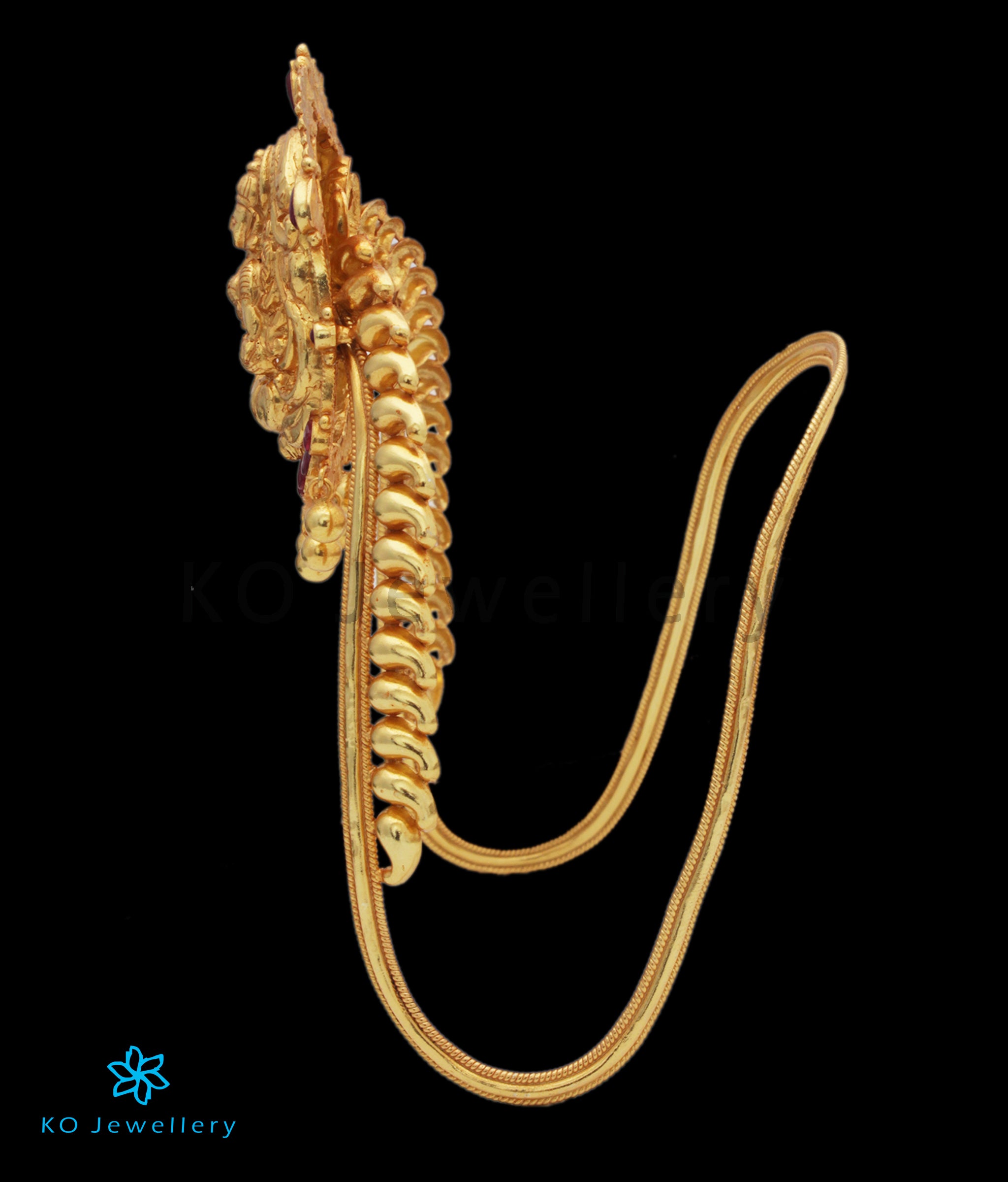 This masterpiece features intricate nakshi (nakkasi) work—a rare, labor-intensive gilt and repousse technique unique to South Indian temple jewellery. The armband’s classic V-shape not only lends it a regal aesthetic but also ensures a flexible, adjustable fit for any arm size.