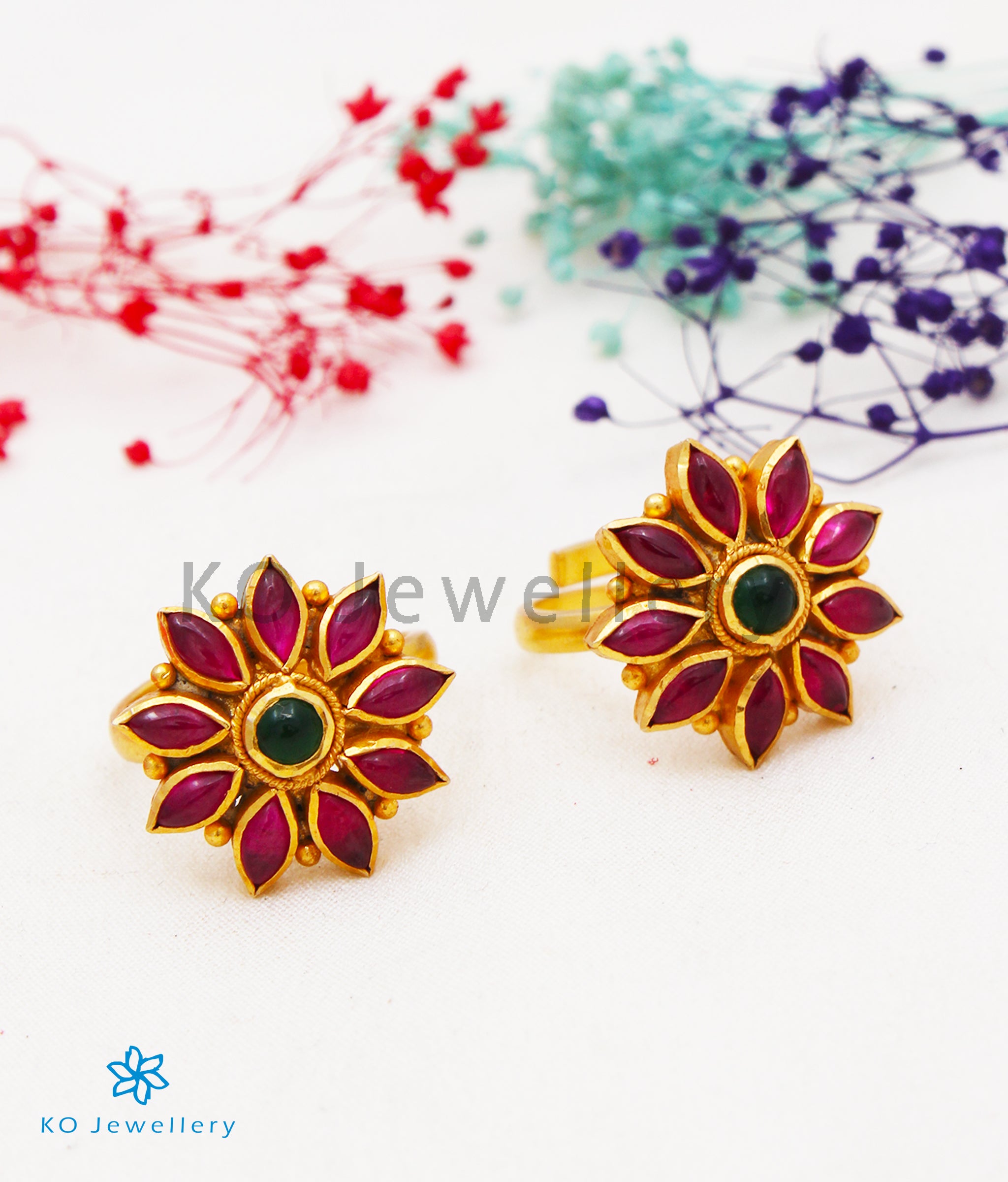 A gorgeous pair of gold-dipped , handcrafted sterling silver (92.5%) toe-rings fit for bridal wear. The pair is decorated with kempu stones and this gives it a gorgeous look.The silver band at the back is an open one and can be adjusted according to your toe-size.