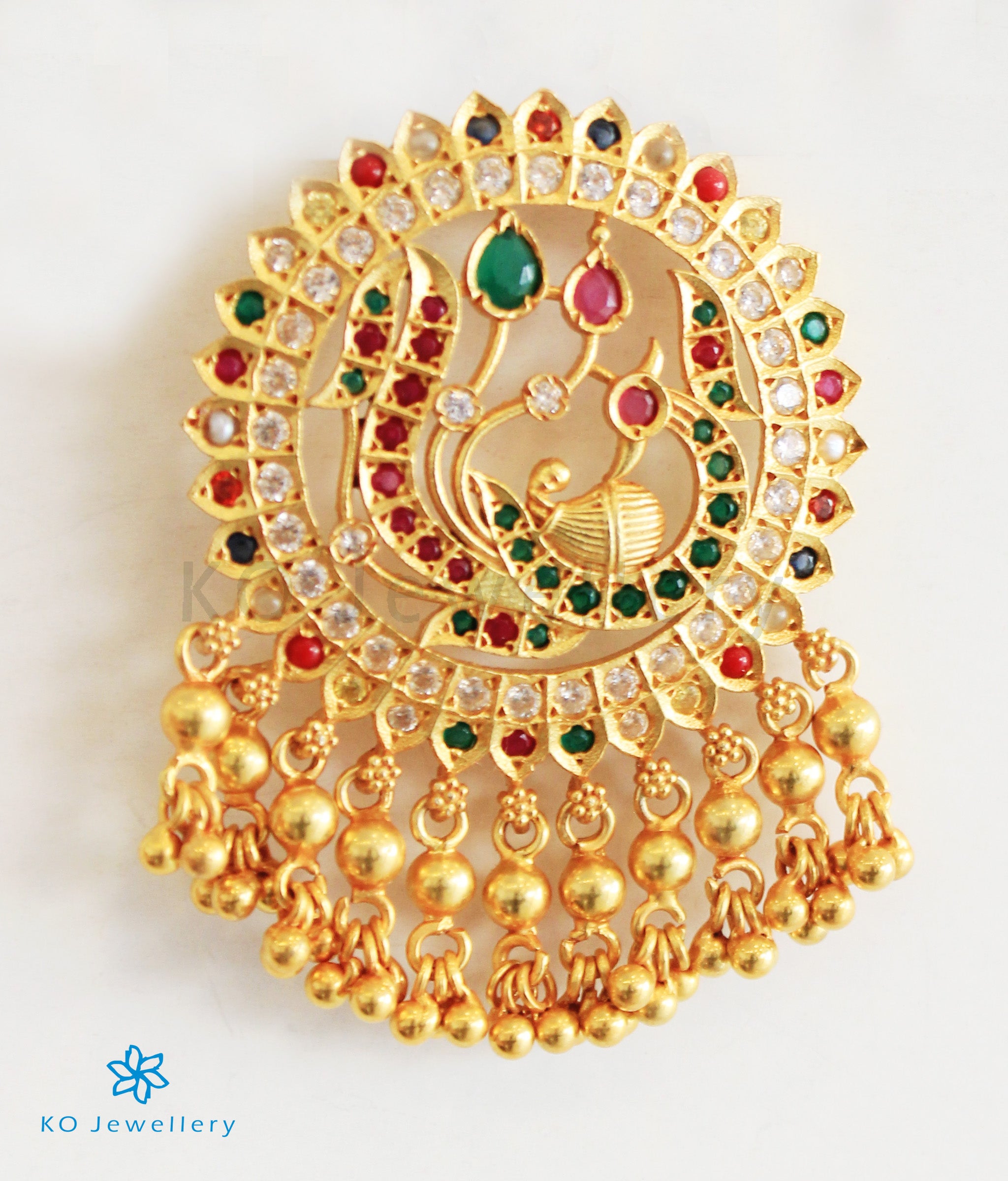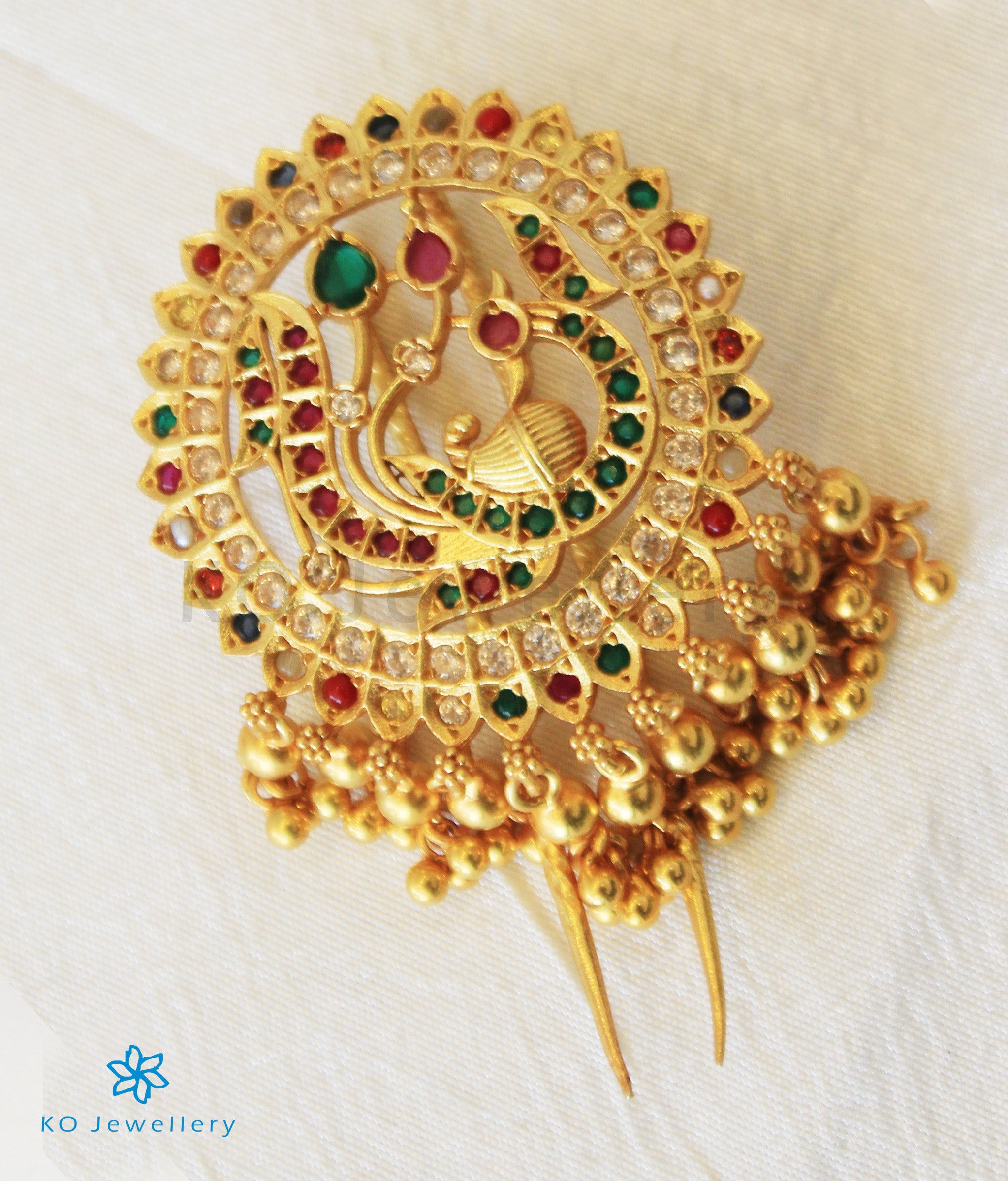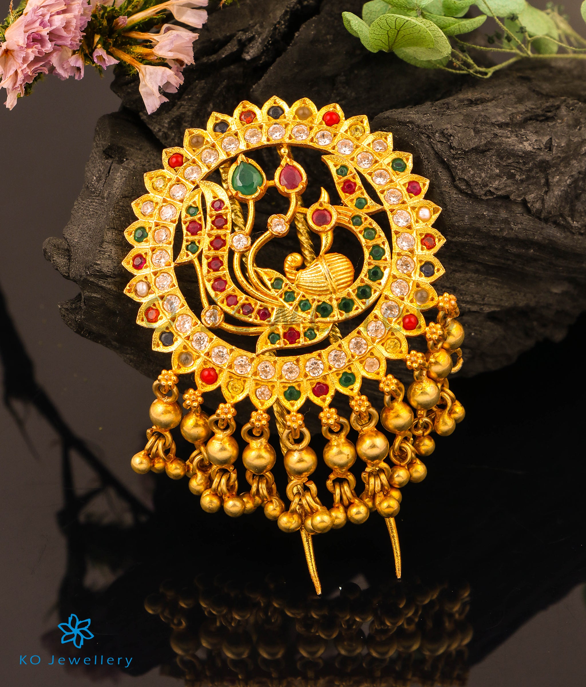 Long hair has been a mark of beauty in India and there are various pieces of jewellery to adorn long tresses.Here we have an ornate hair-clip studded with navratna stones ,with a beautiful peacock at the center which is its main attraction.