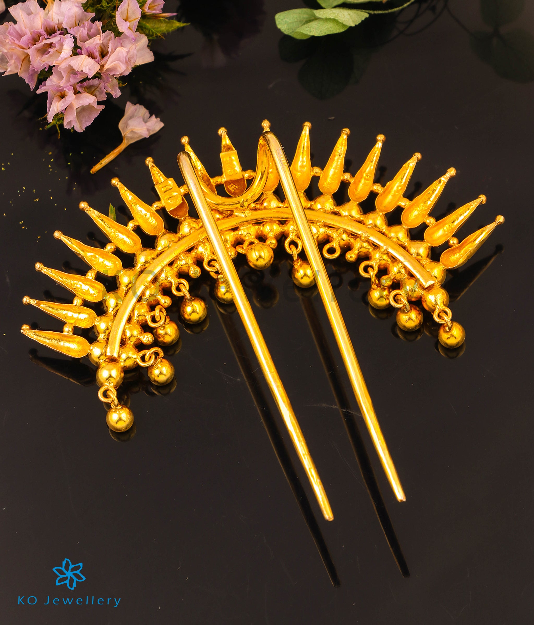 The preference for adorning long tresses with garlands of jasmine flowers is well known, the jasmine motif is carried into the design of hair ornaments too. In this pretty hair-clip studded with kempu stones we see the `moggu' (Jasmine bud) motif. Tiny gold-dipped balls added for decoration give it an added attraction. Handcrafted in Sterling Silver (92.5%) and gold-dipped to perfection using techniques used in ancient South Indian antique gold temple jewellery.This piece is also available in the antique silver finish on request.