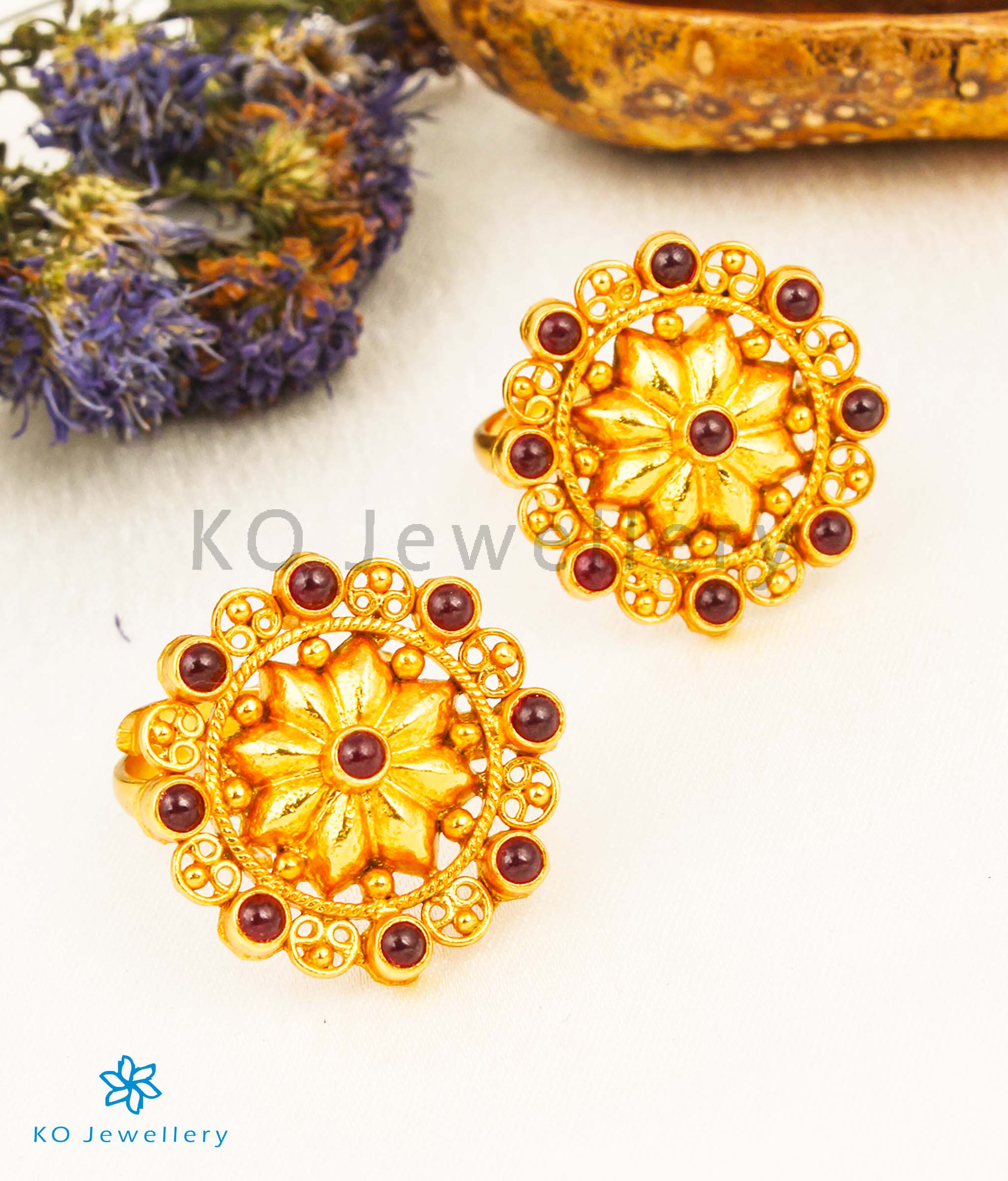 A gorgeous pair of handcrafted sterling silver (92.5%) toe-rings with kempu stones. The intricate design at the center is decorated with kempu stones and this gives this pair an attractive look. The silver band at the back is an open one and can be adjusted according to your toe-size.