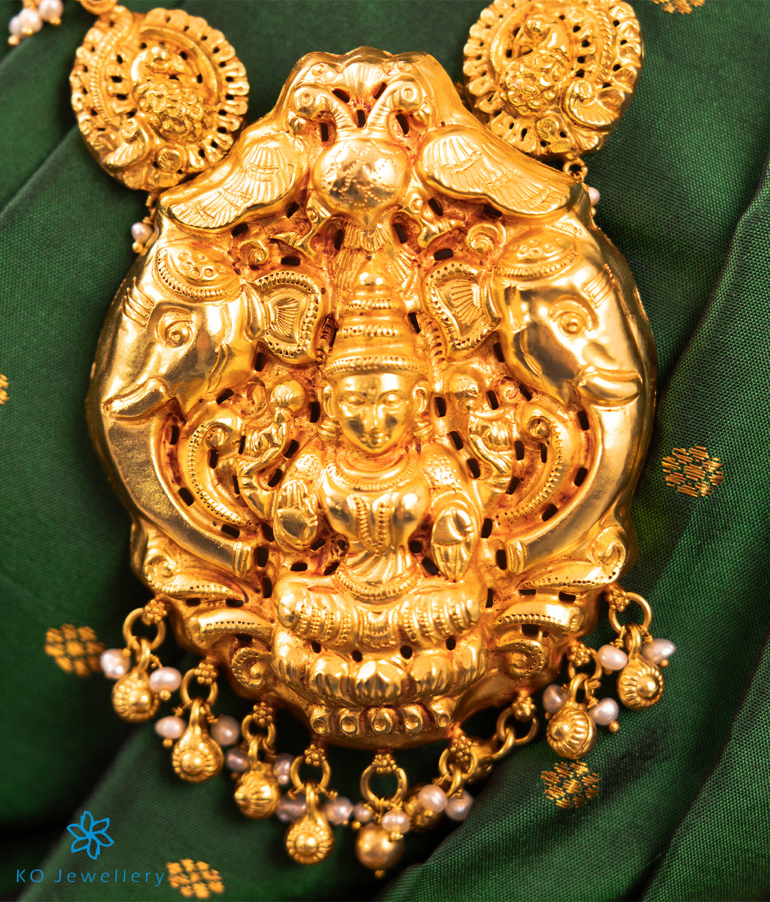 One of the most striking features of `nakkasi' jewellery is that the gods/figures depicted seem to have a life-like quality.In this ornate nakkasi pendant the image of Goddess Lakshmi flanked by two majestic elephants and peacocks is reproduced in rare detail, in three dimensional repousse. An ornate necklace with an irresistible antique charm,this is sure to become a heirloom.
