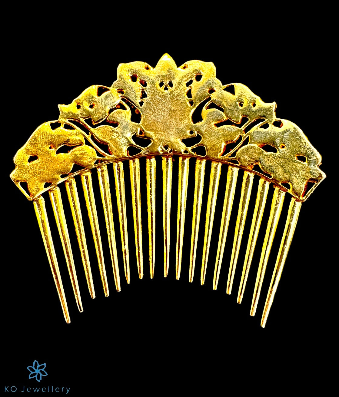 Long hair has been a mark of beauty in India and there are various pieces of jewellery to adorn long tresses. Here we have an ornate hair-clip studded with red, green and white polki stones and premium Zircon in the shape of a comb. It is easy to fix and gives a bejewelled look to your tresses.