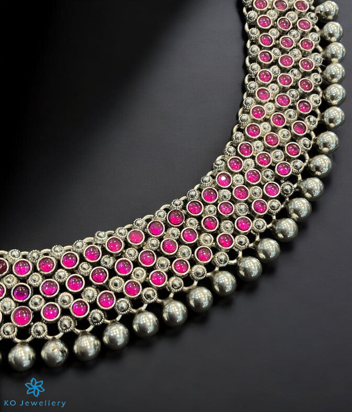 The craftsmanship behind this necklace is truly exceptional, reflecting the refined techniques of South Indian antique jewellery. Each element has been meticulously crafted and joined with precision, showcasing a perfect balance of skill and artistry. The oxidised finish imparts a dark, antique allure, enhancing its vintage charm.